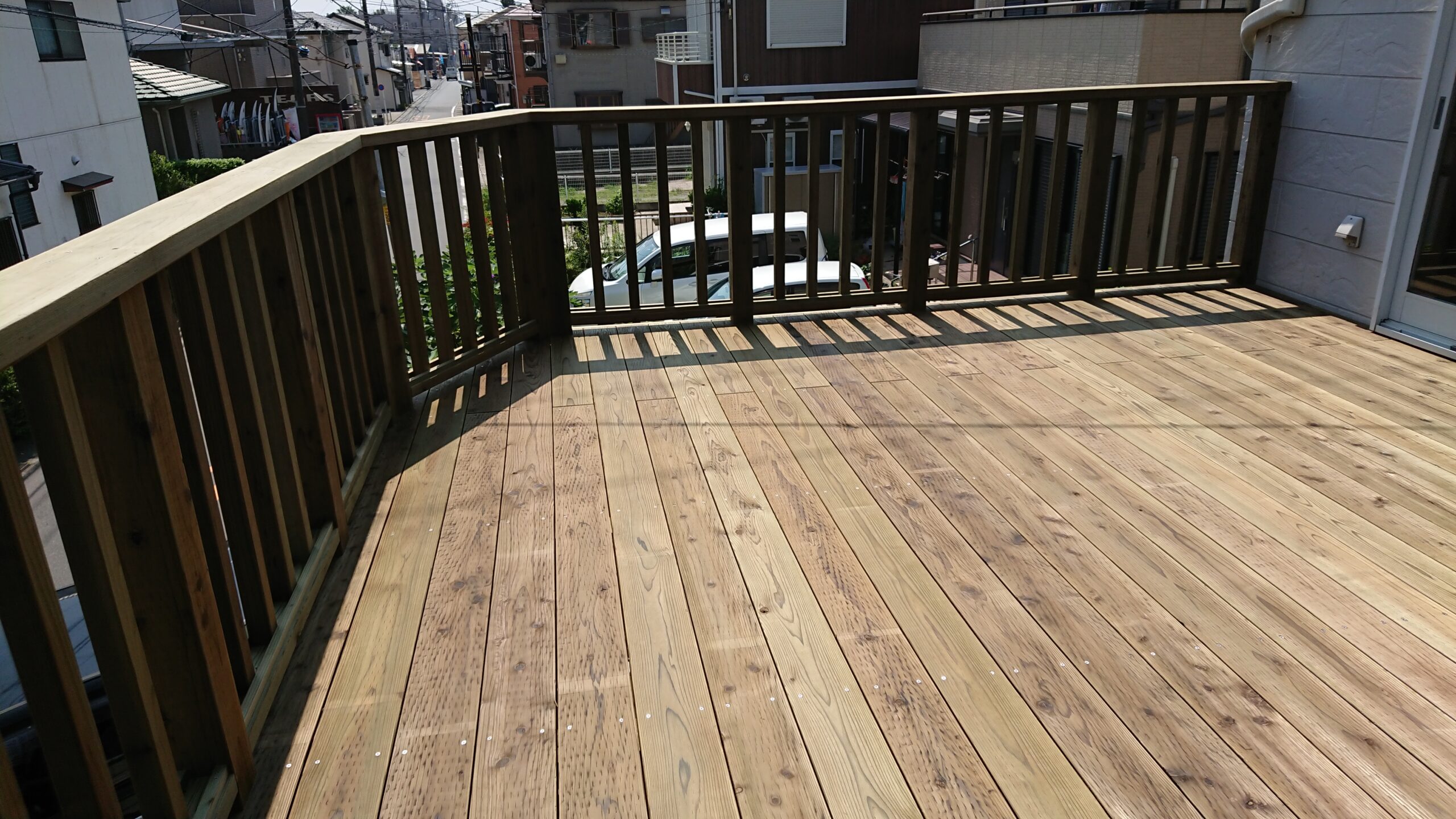 こうして広い天然木のウッドデッキが陽射しの中で神々しく光って見える。