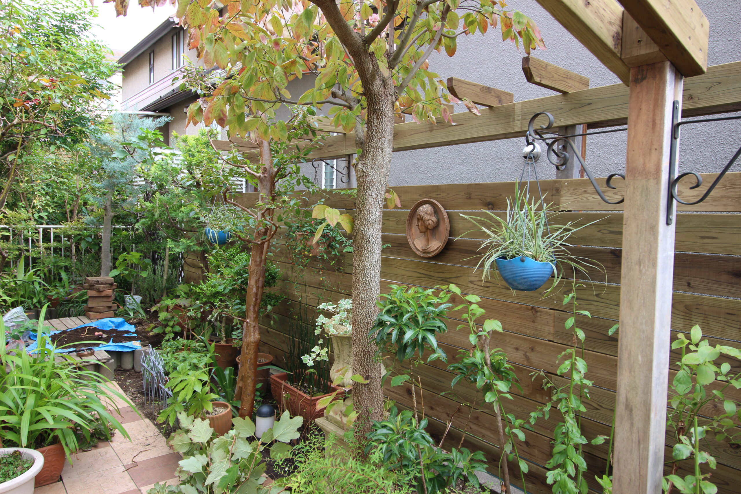 フェンス=壁面 とし、フェンスに奥様がコレクションされたアクセサリーを飾って個性的に