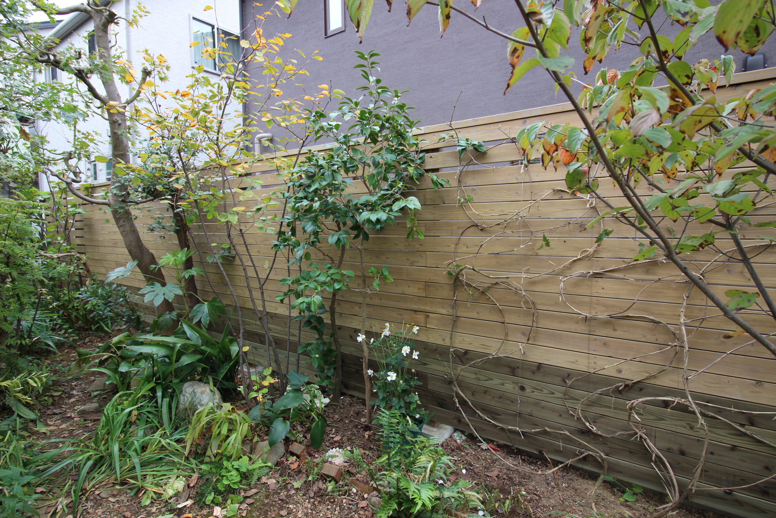 幅広の桟を使った横桟にパーゴラを一部とり入れてアクセントにしたフェンスです。