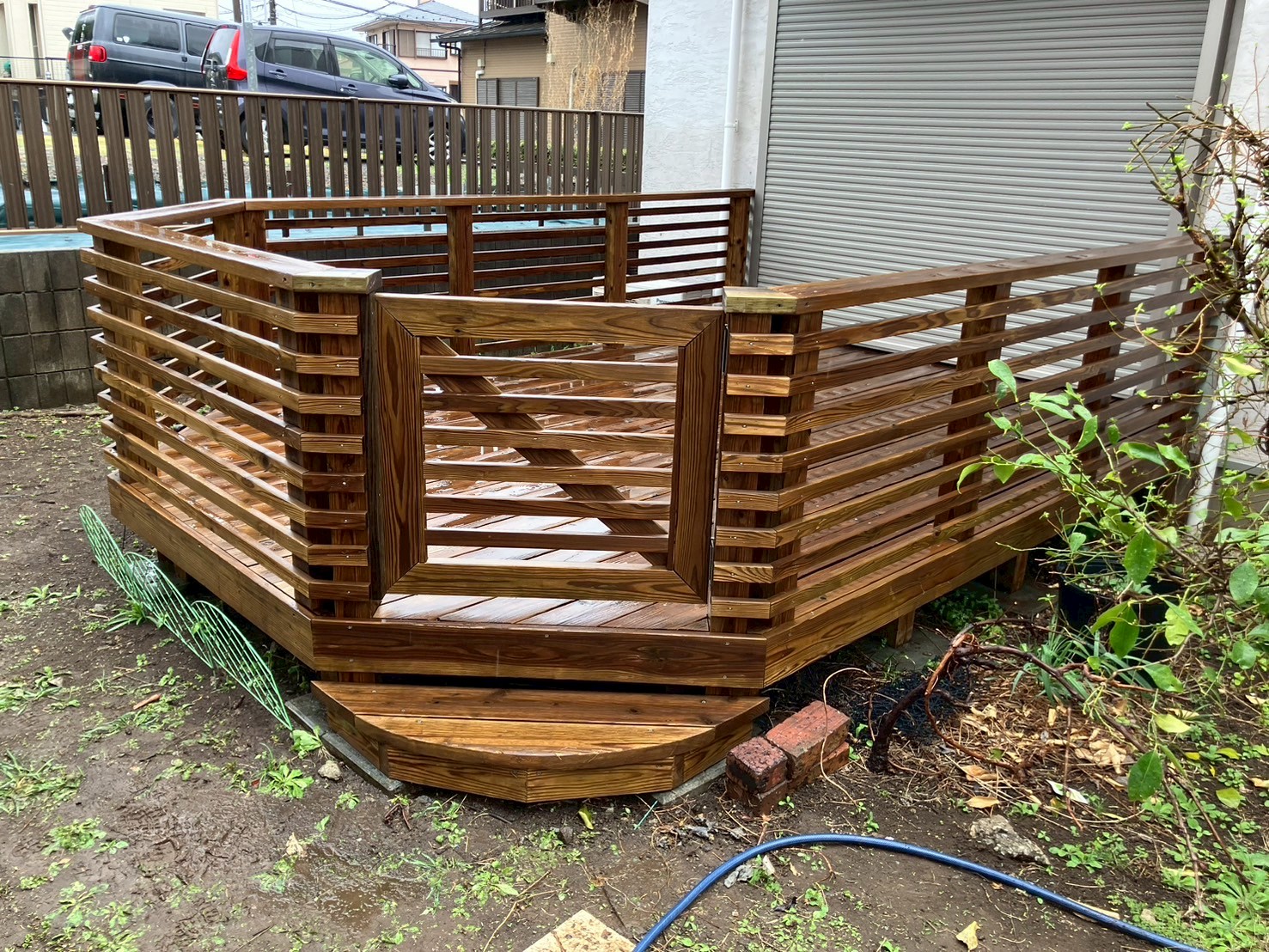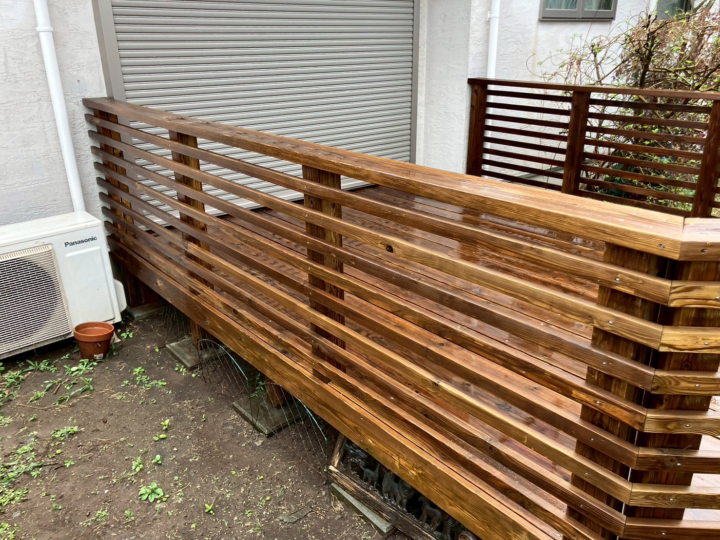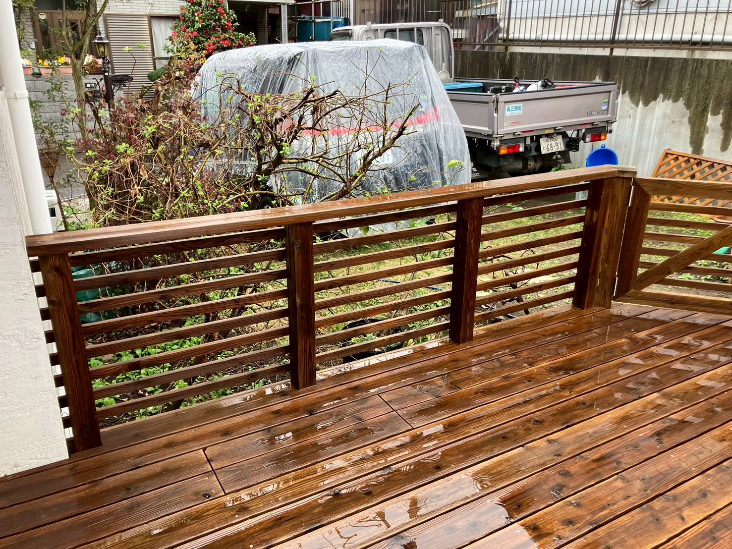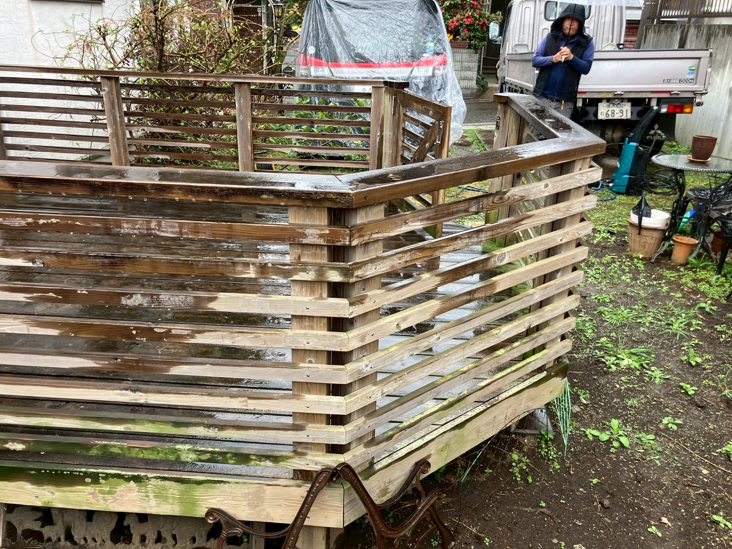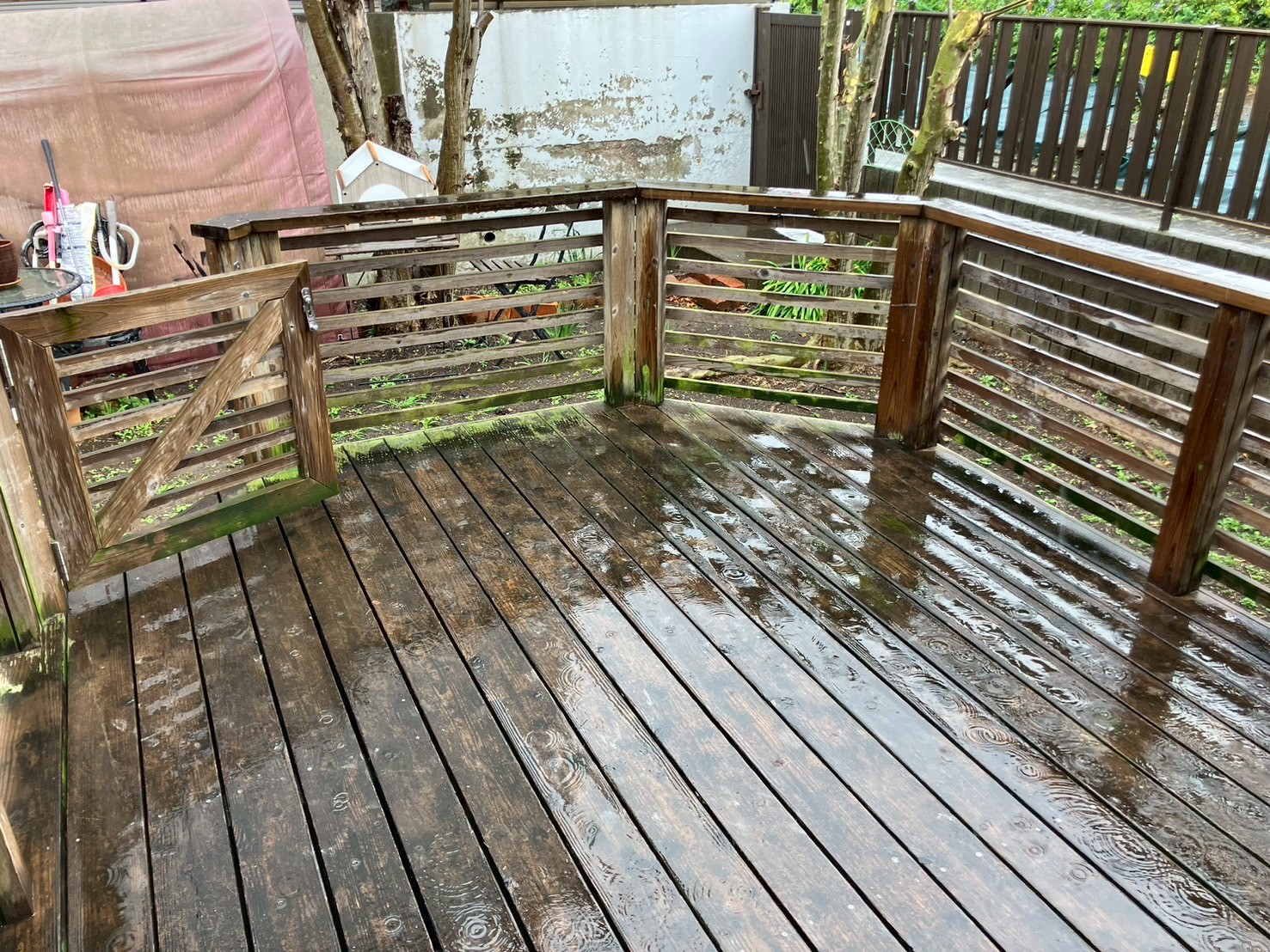 全ての、ウッドデッキの部分を、圧は多少弱めに。よく外壁の塗り替えで入った塗装業者の方が、ついでにと外壁洗浄と同じ圧で洗浄して傷がつくことが多々ありますので。