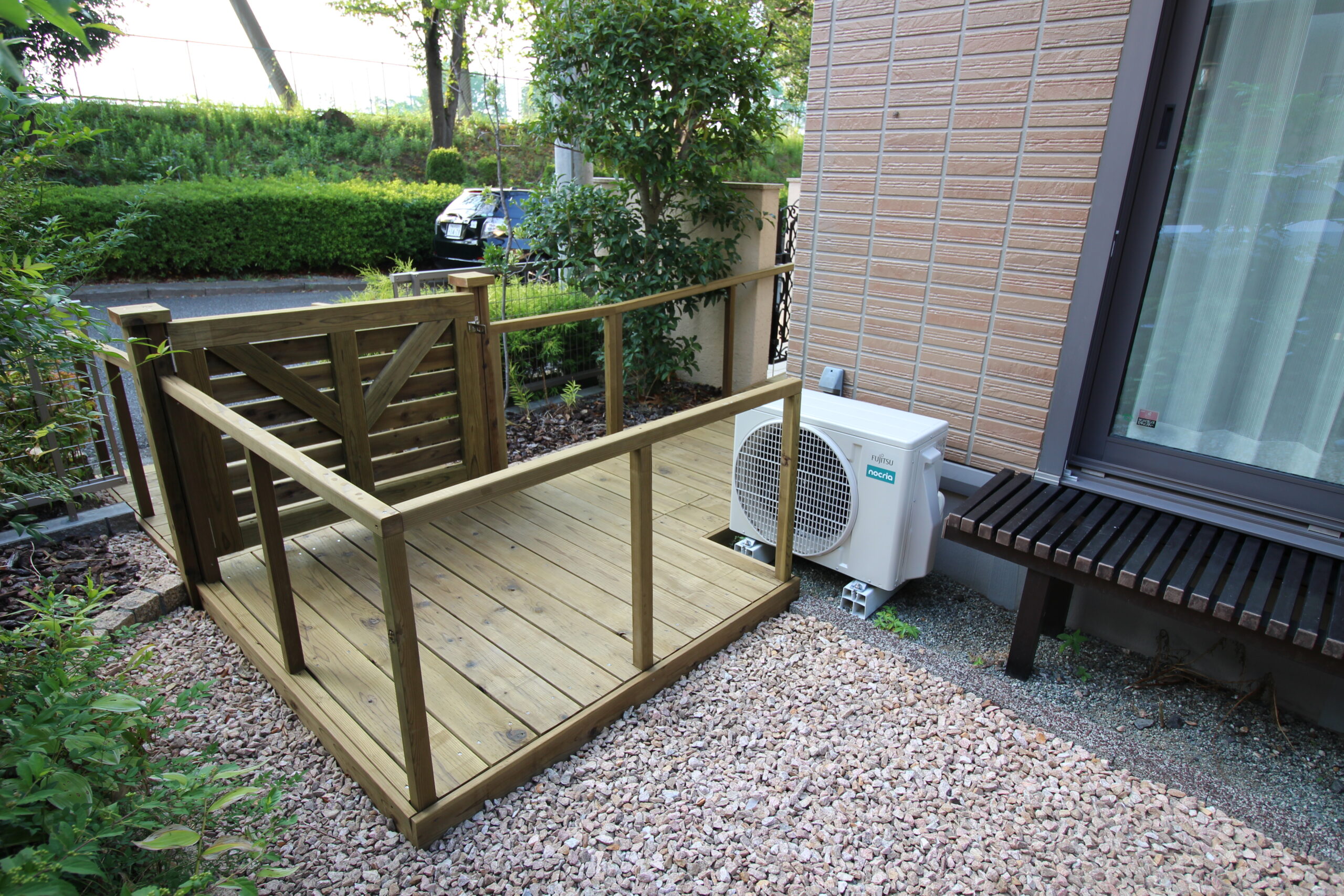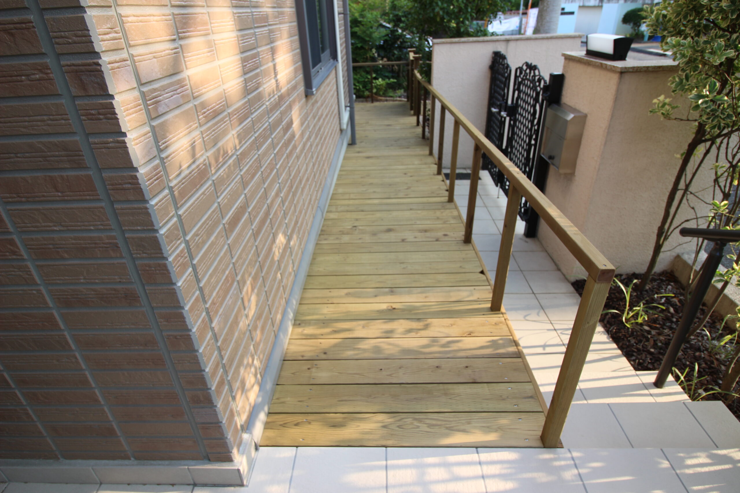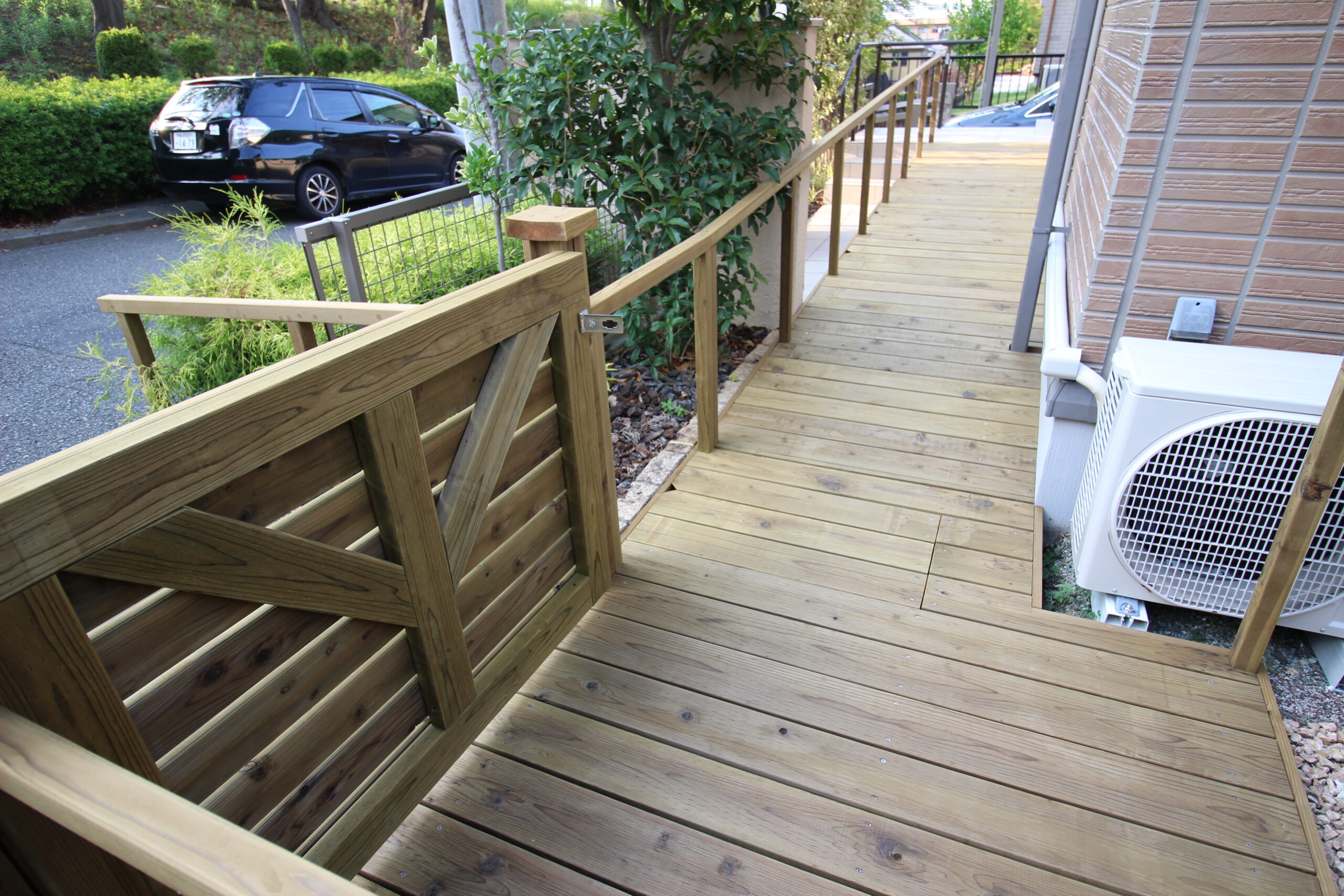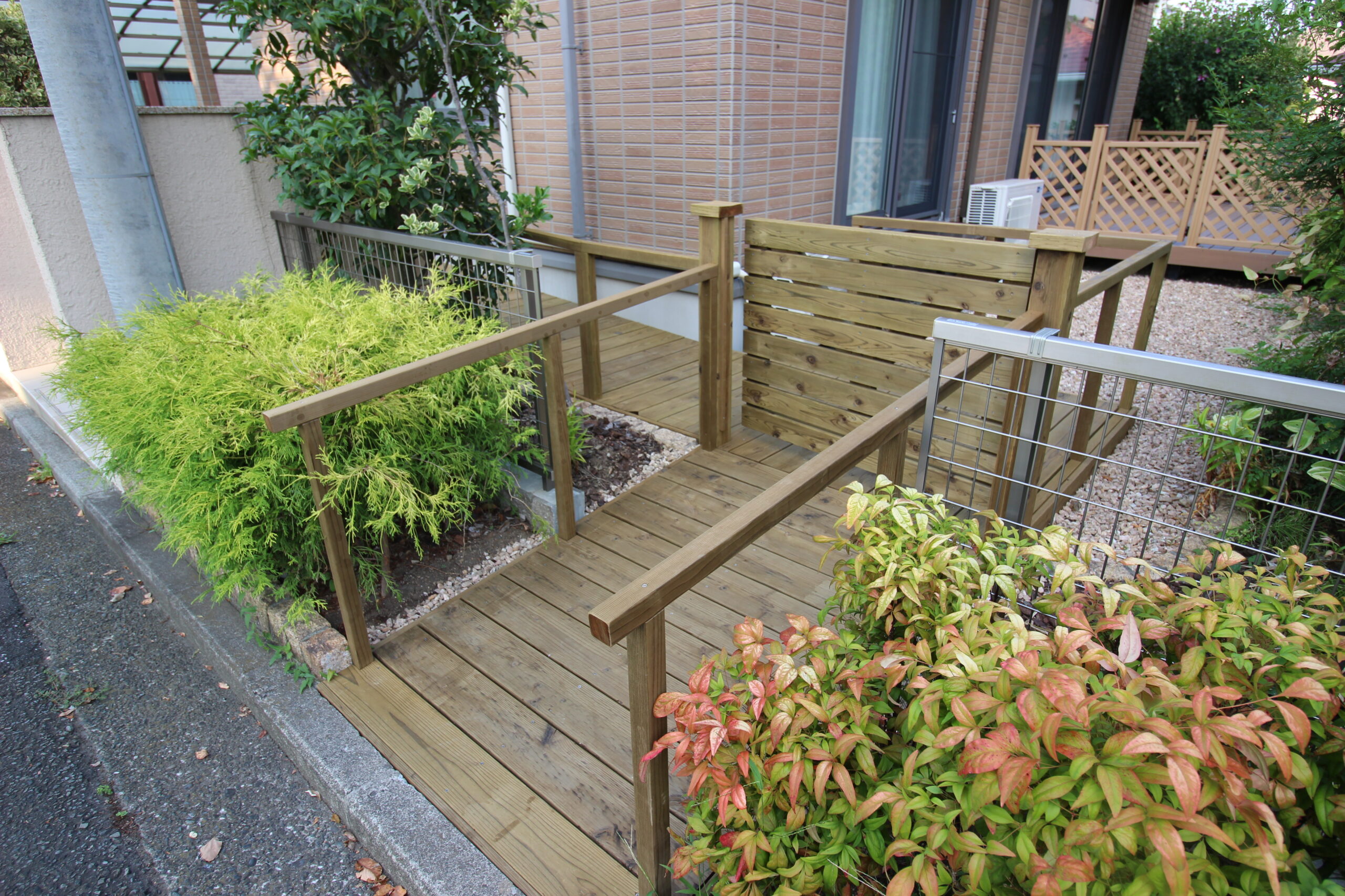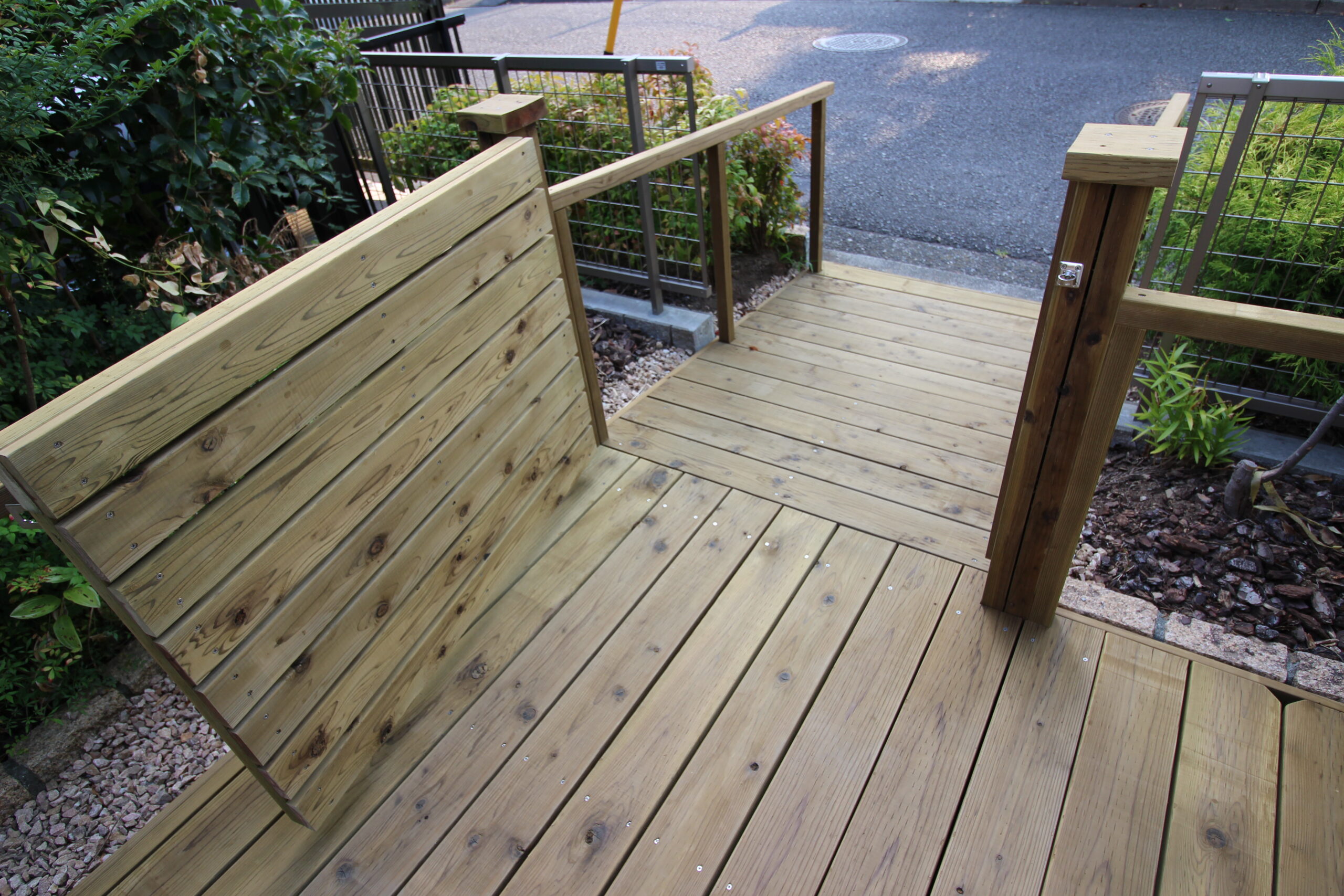 道路から、楽に出入りできる木製門扉と開放的なスロープのウッドデッキ。