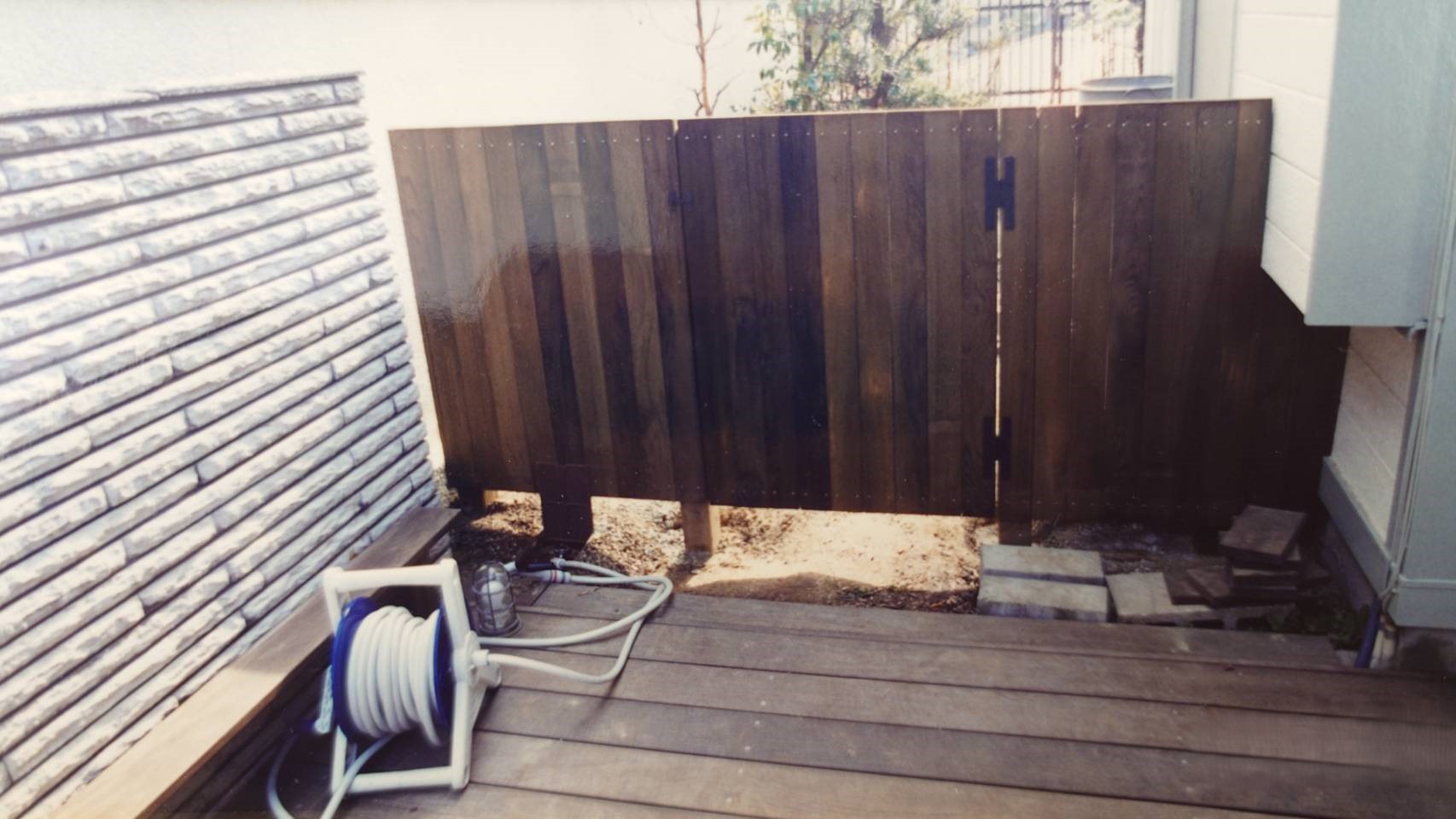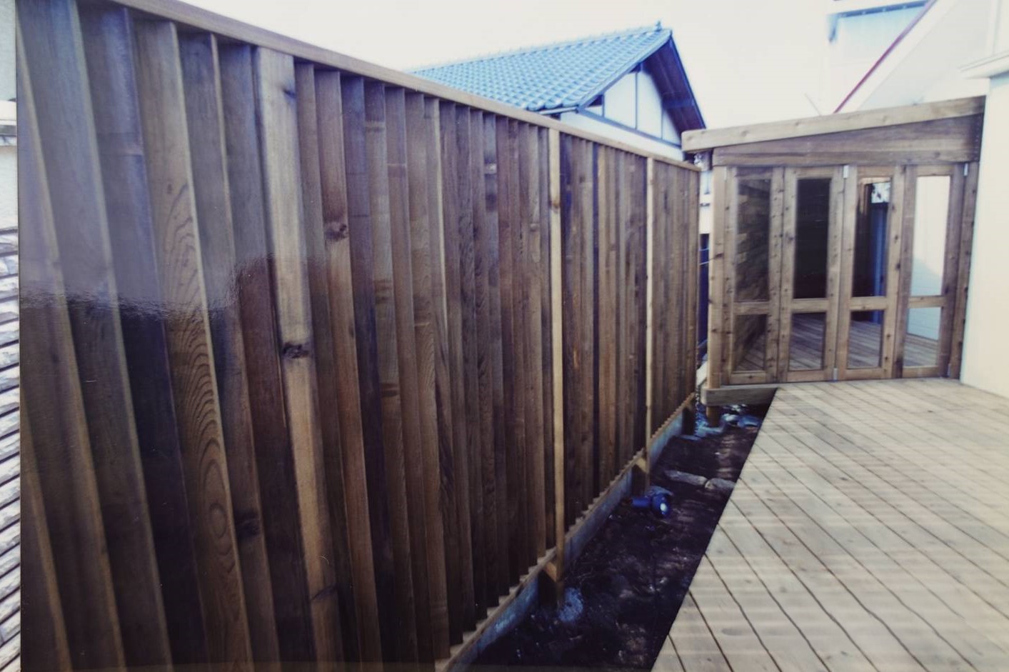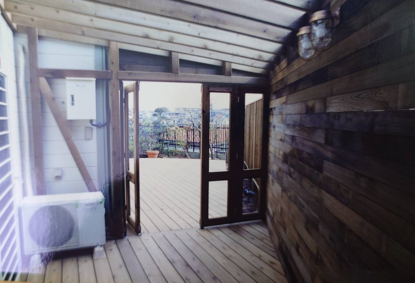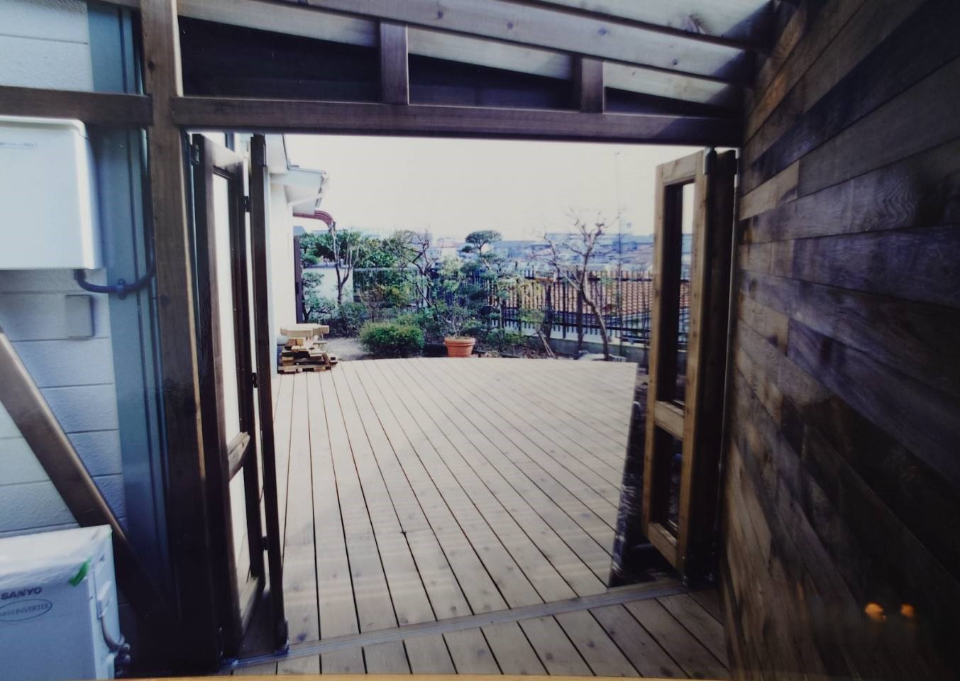 遠近法で広く見えるが、実際すごく拡がりがあります。ウッドデッキの終点にコンサバトリーがあり、趣味の部屋兼愛犬の大きすぎる犬小屋。