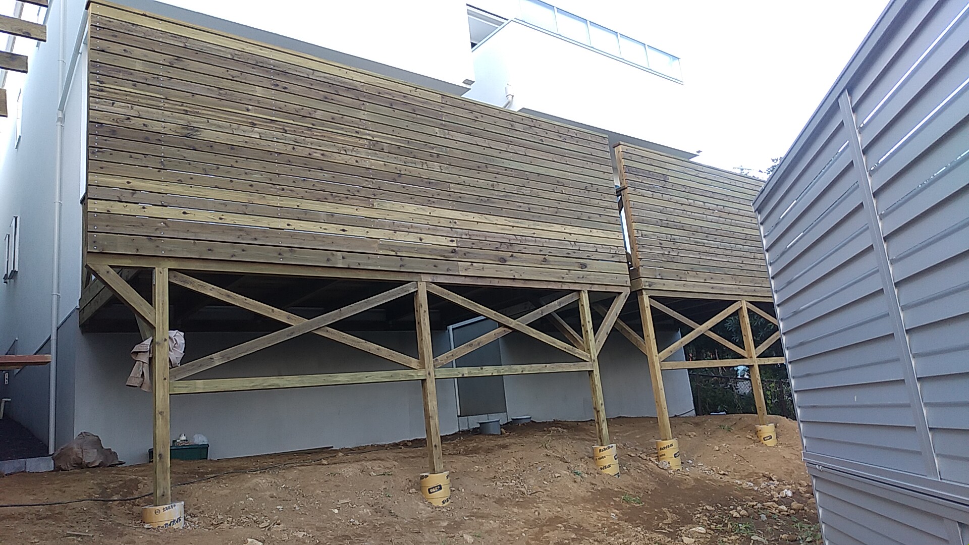 傾斜地のデッキで、基礎もしっかり上部の構築物を支えるように作るので、支持地盤に基礎が乗っからるように。