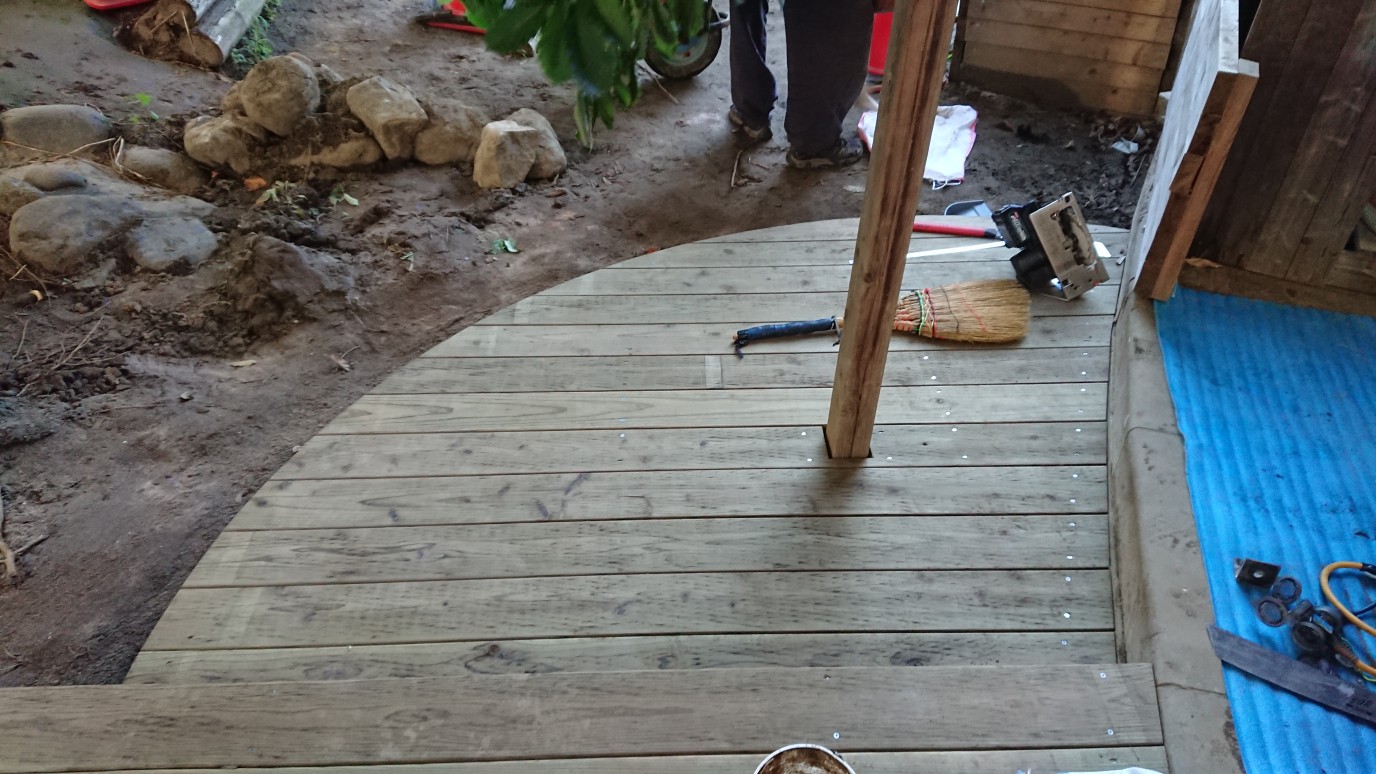 国産のソフトウッドでありながら、高耐久処理された特許材LBウッドを使いいつも施工してますが、こうした自由な曲線とかすかに残る木の香がやさしいウッドデッキ