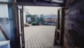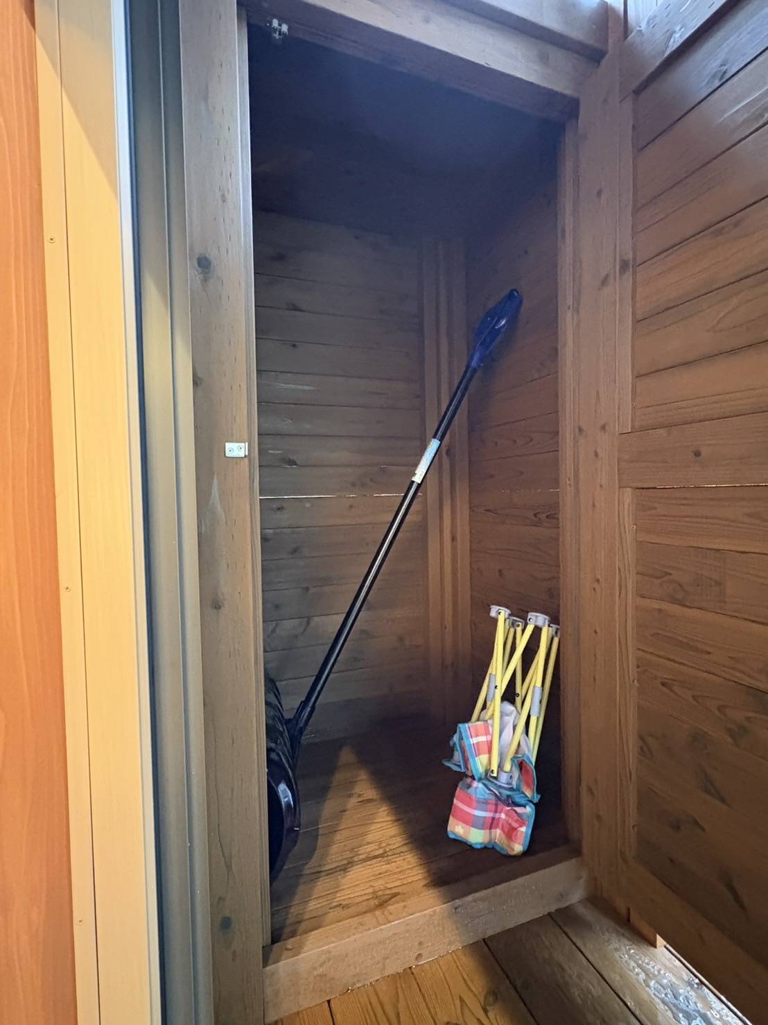 頻繁に来られる別荘の為、長期滞在も見通した、ウッドデッキ上の収納庫。掃除用品もしっかりと入れられています。