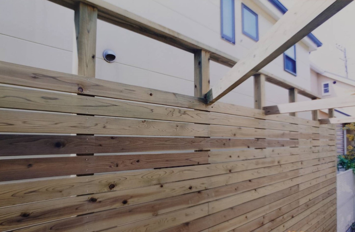 高い木製フェンスなので、家の壁面で支えた方が安定するということで、パーゴラ風の支え板をつけました。
