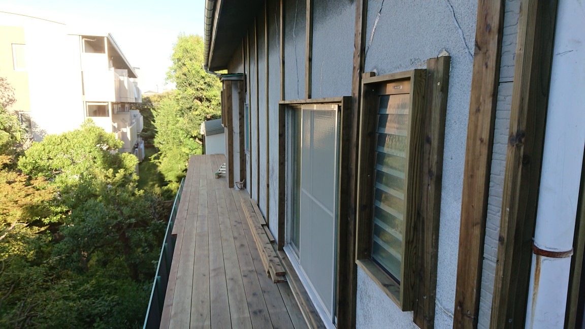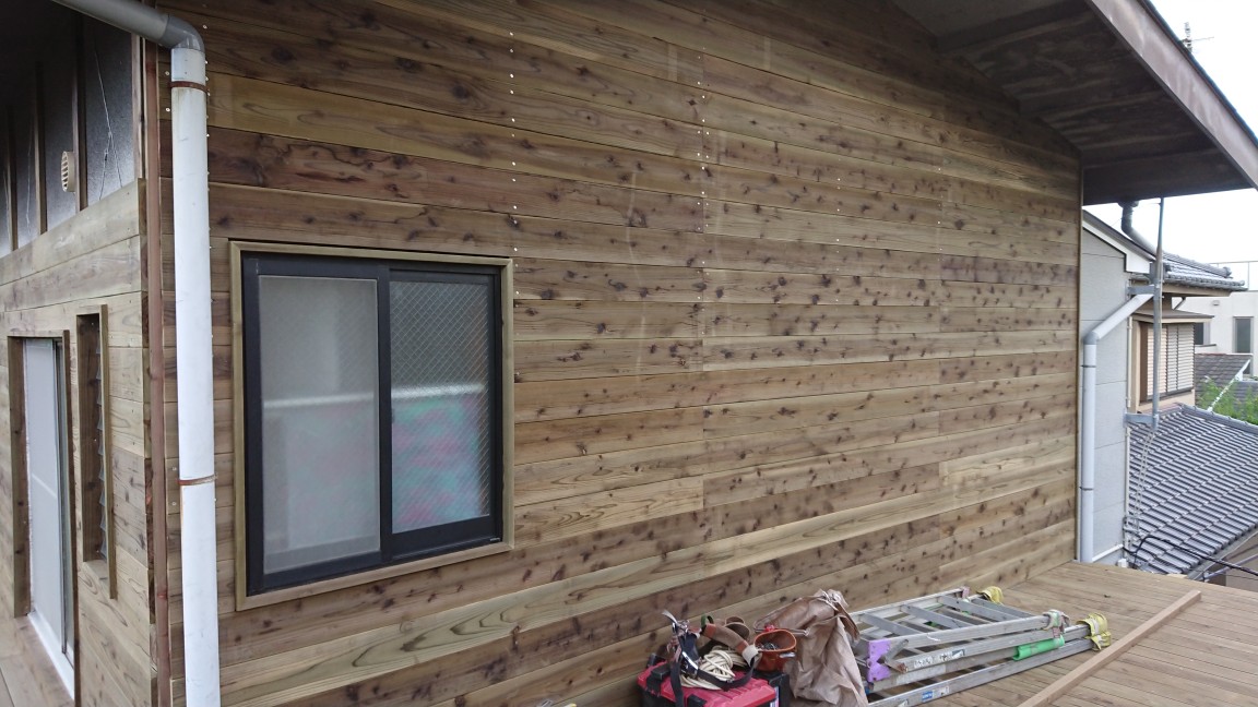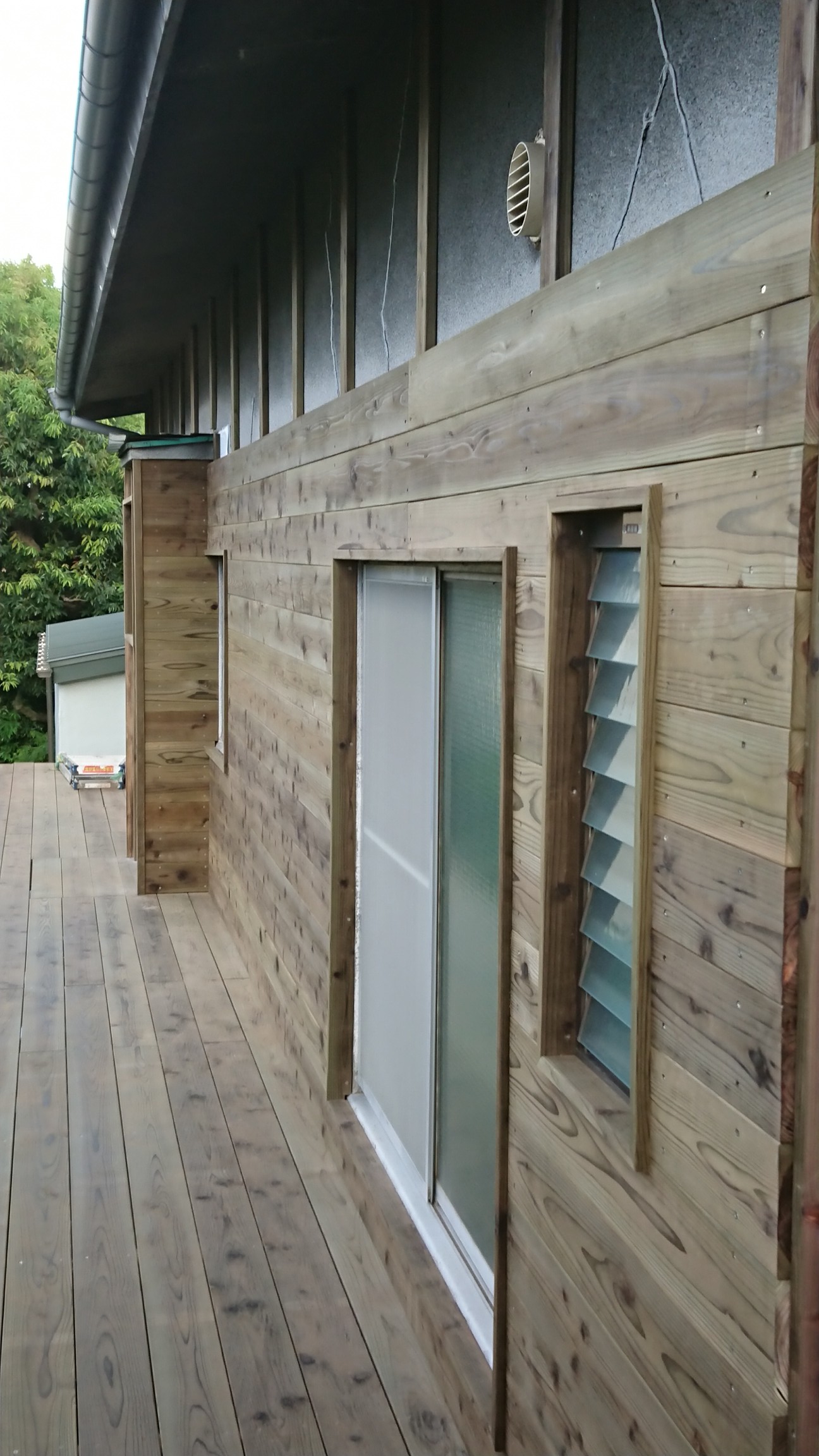 築50年以上の家の外壁が山小屋風になり、様変わり。前のウッドデッキも同じく高耐久処理のLBウッドで作られています。