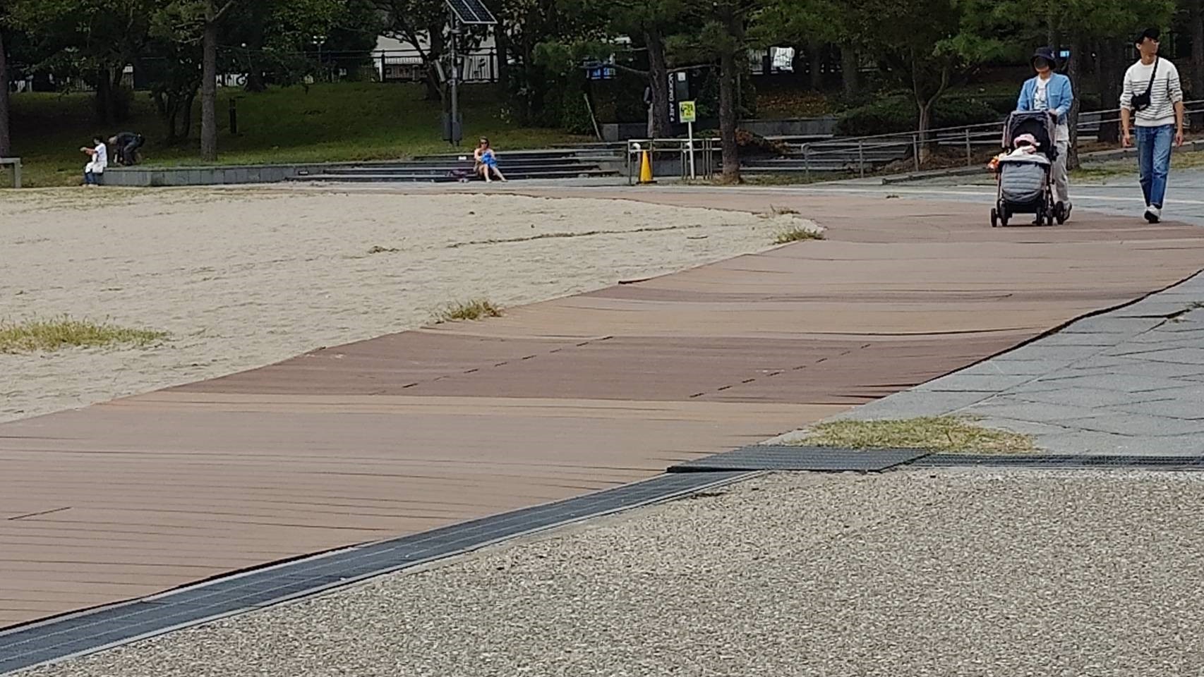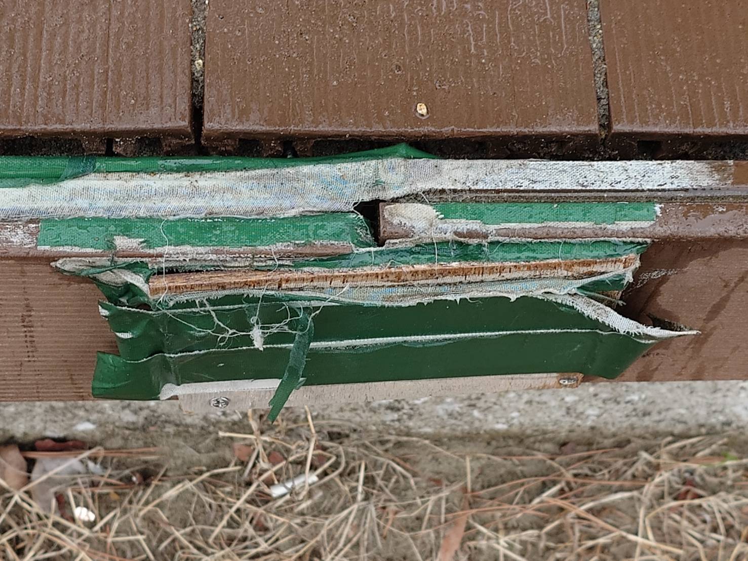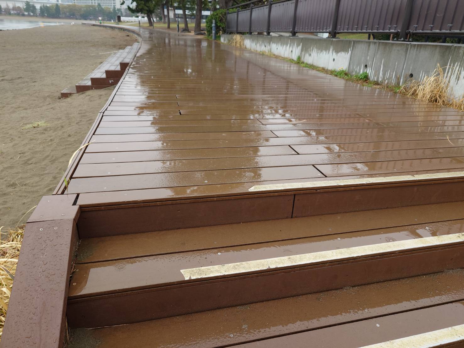 2024.4.20での人工木のボードウォーク。階段の縁が割れて、ガムテープで補修。