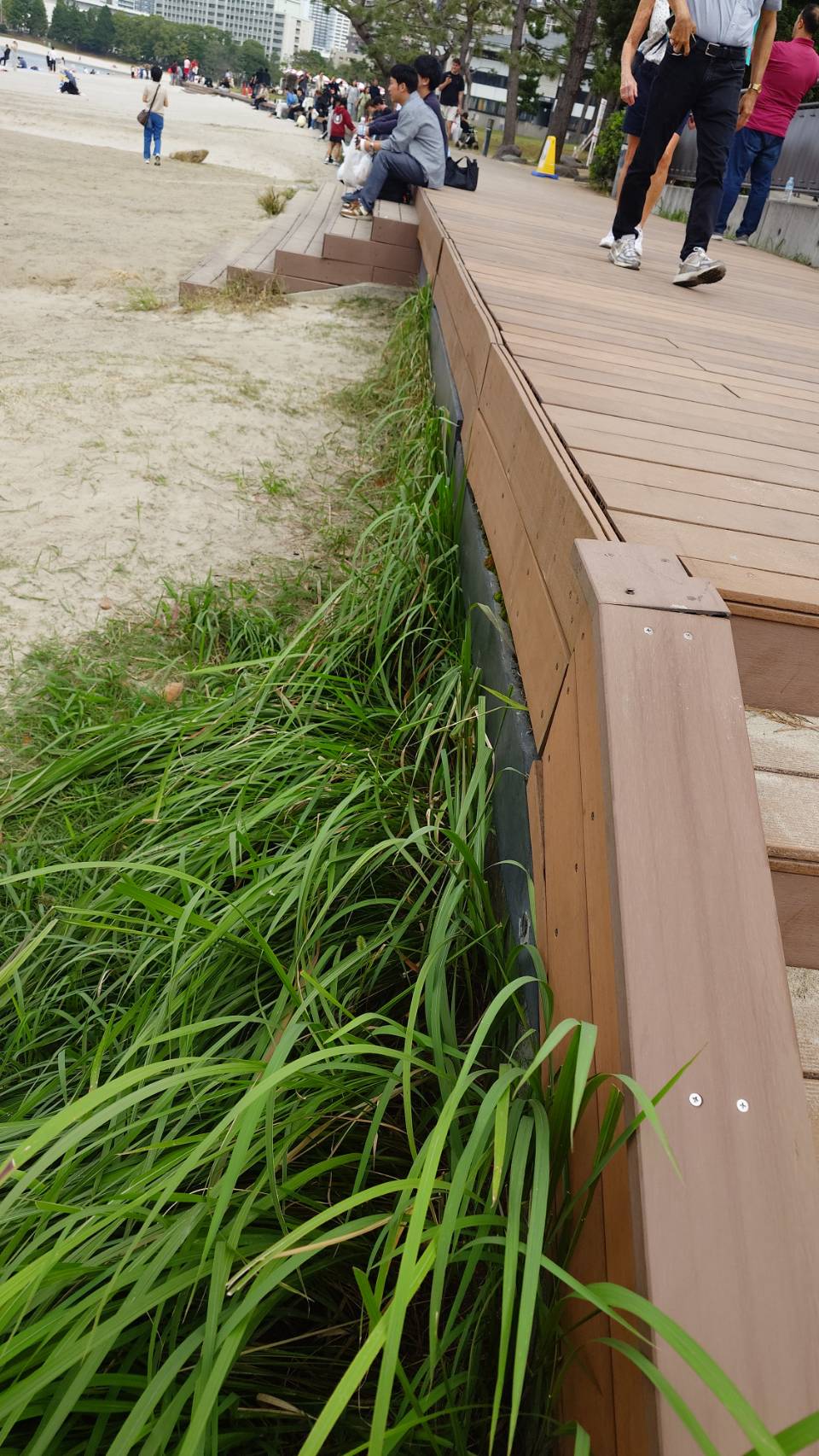 お台場の海浜公園のボードウォークは、20年以上前から観察しています。最初は、無処理のソフトウッドで出来ていましたが、その後ハードウッド(セランガンバツ)になり、現在人工木で作り替えられています。