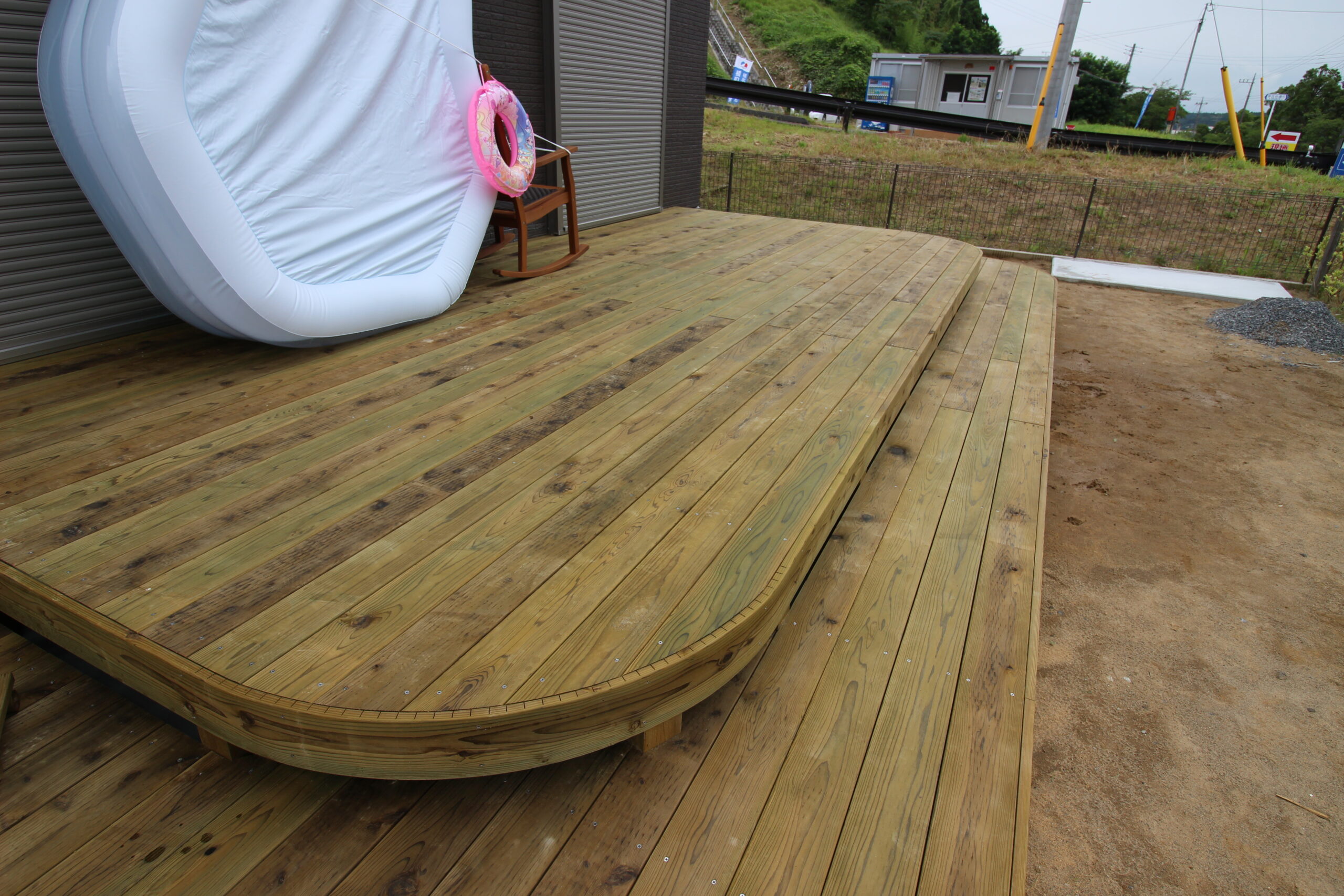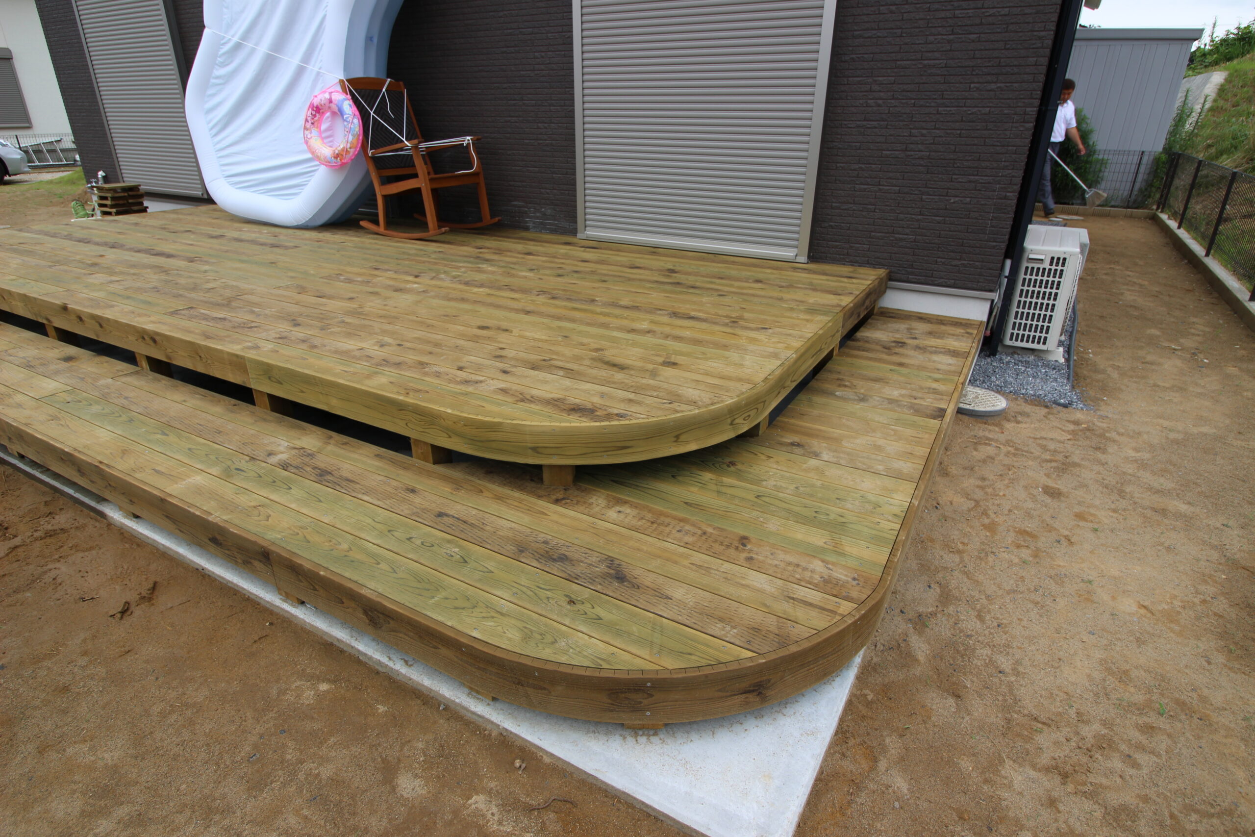 二段階式の階段形式になるウッドデッキ。この角のアールの姿がデザインのポイントであり、角張った硬さをほぐして優しさを見せてくれます。