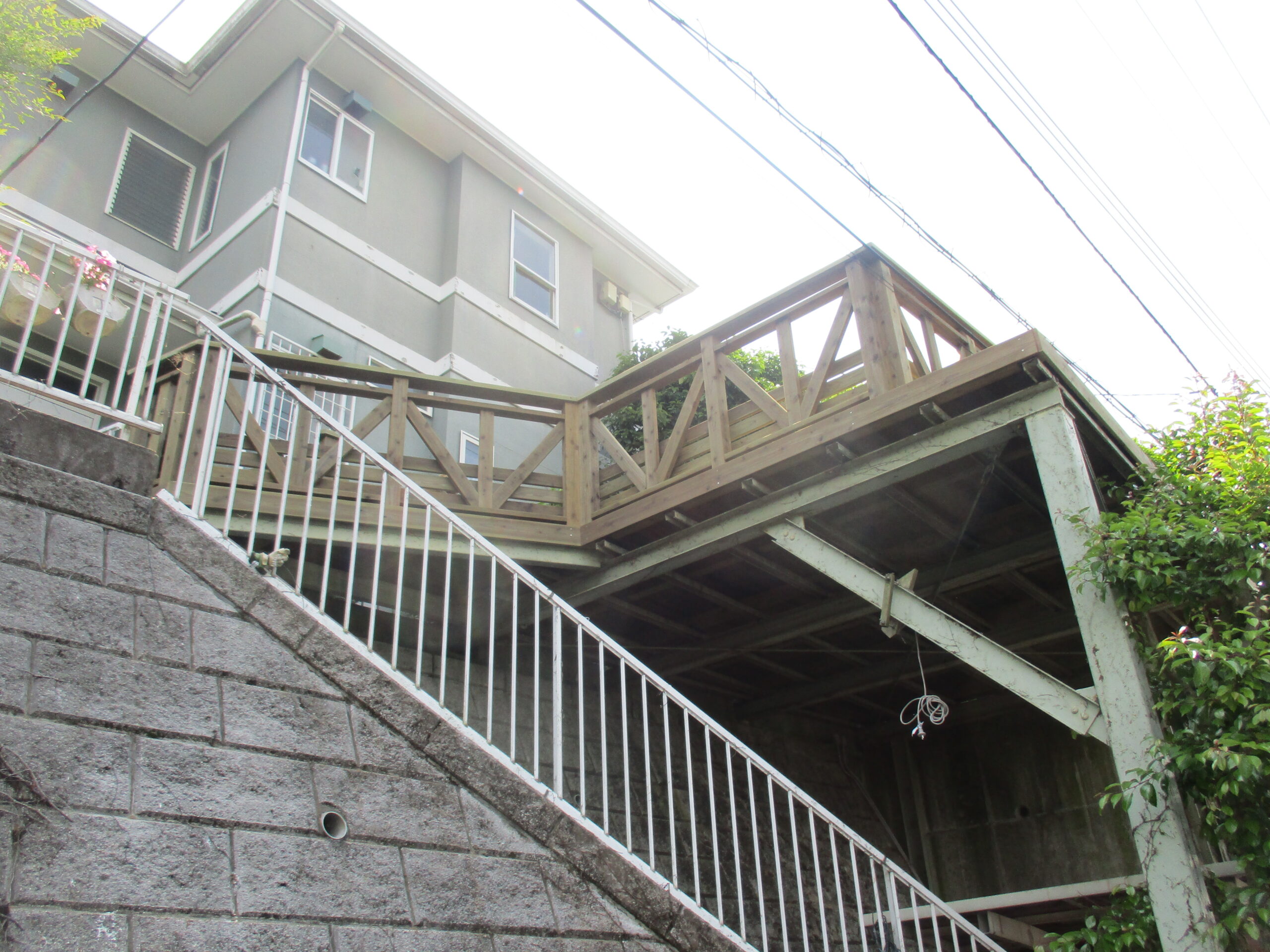 この鉄骨は、既存のウッドデッキを解体したら、鉄骨の上側(鉄骨と木の接触部)が錆びていたので、錆落としして、金属亜鉛の錆び止めを塗布して大引を廻し始めた。LBウッドが直接接触しないようにさせようと。