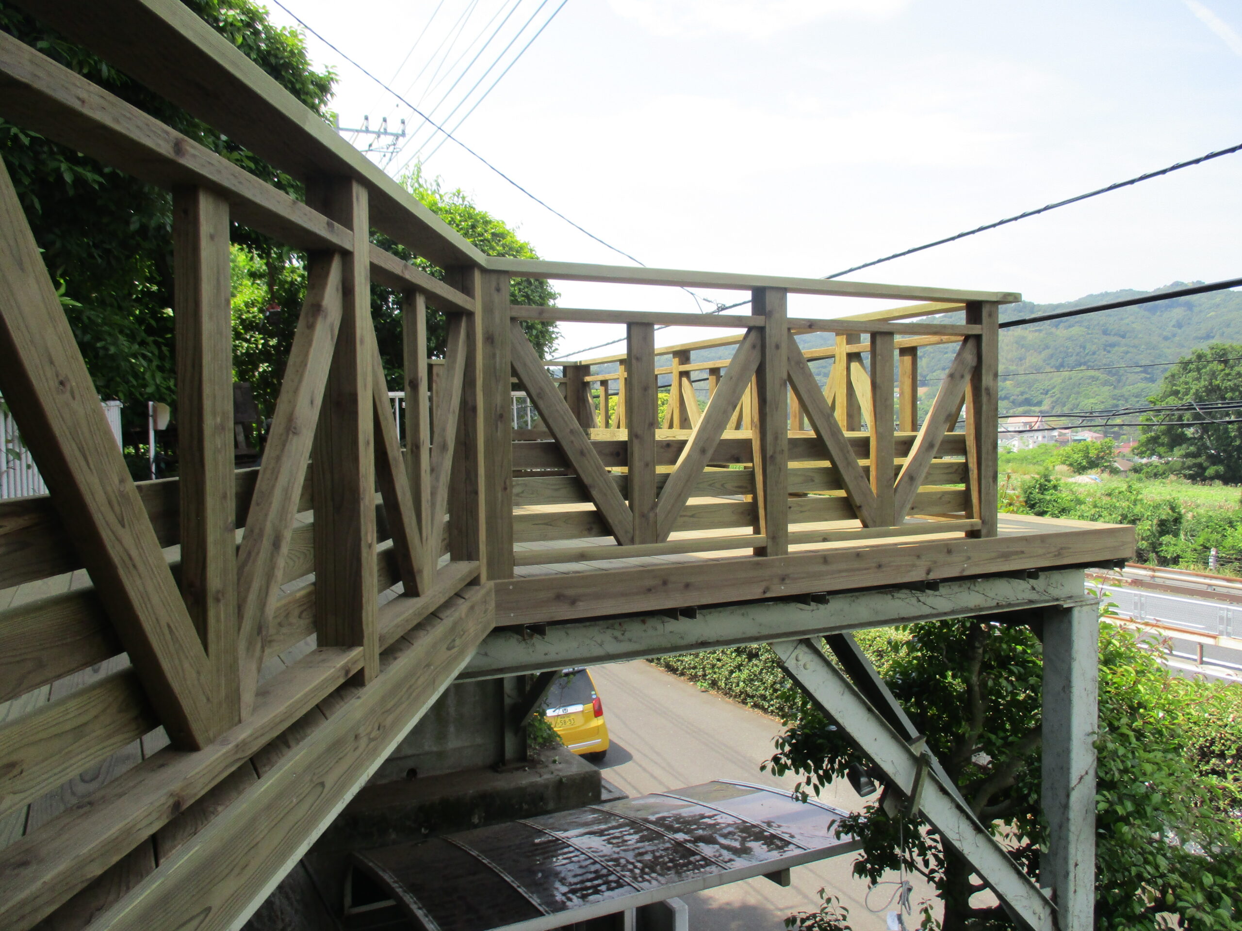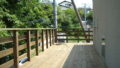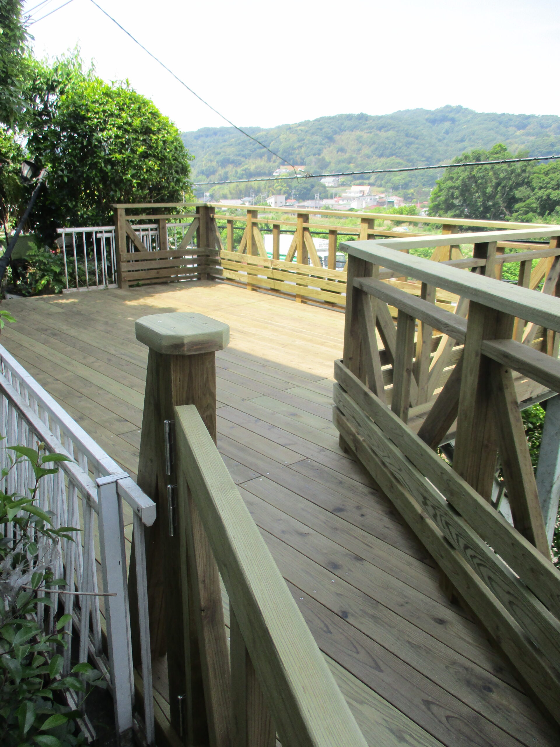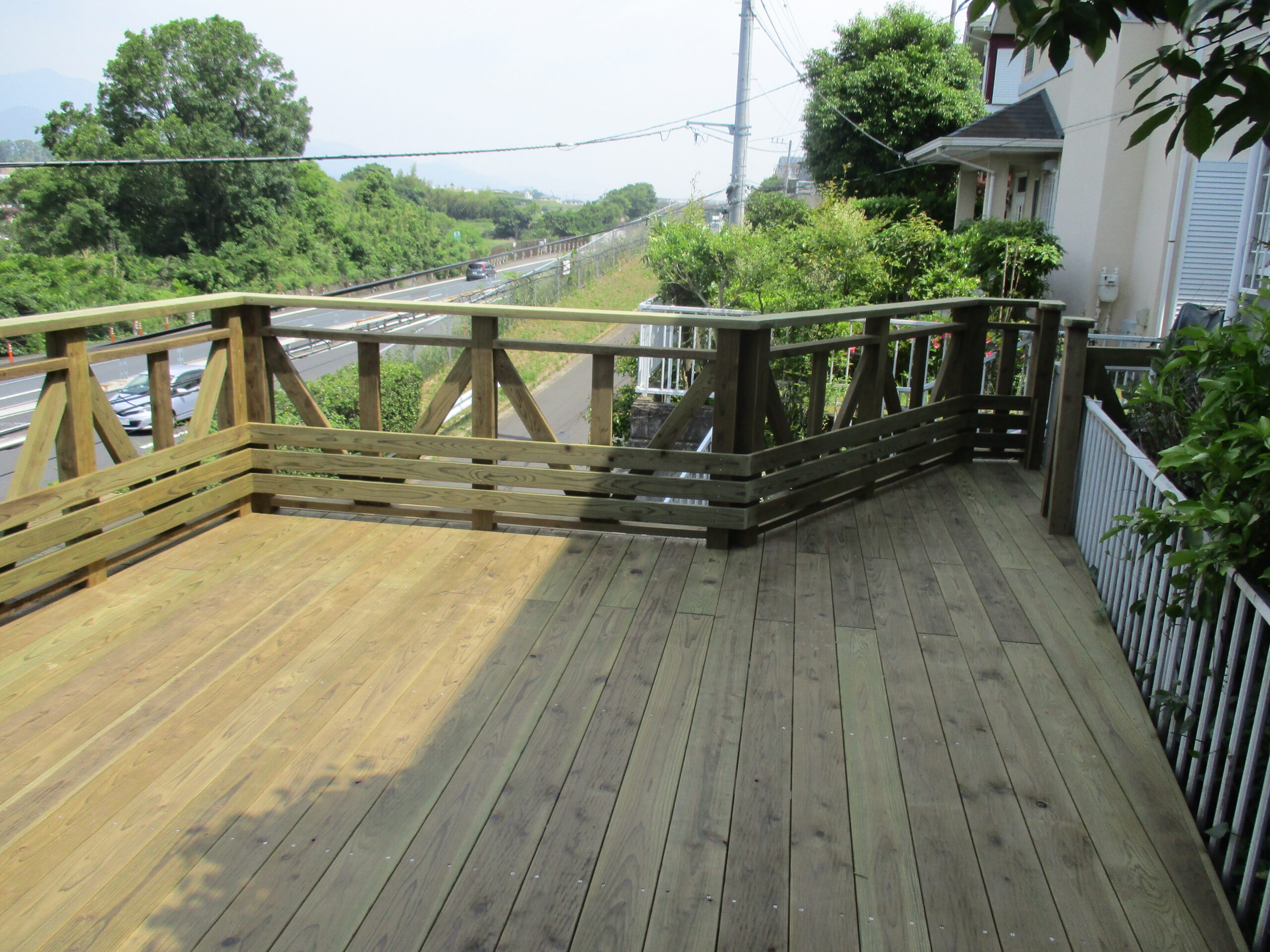 玄関から架け橋のようにウッドデッキが延びている