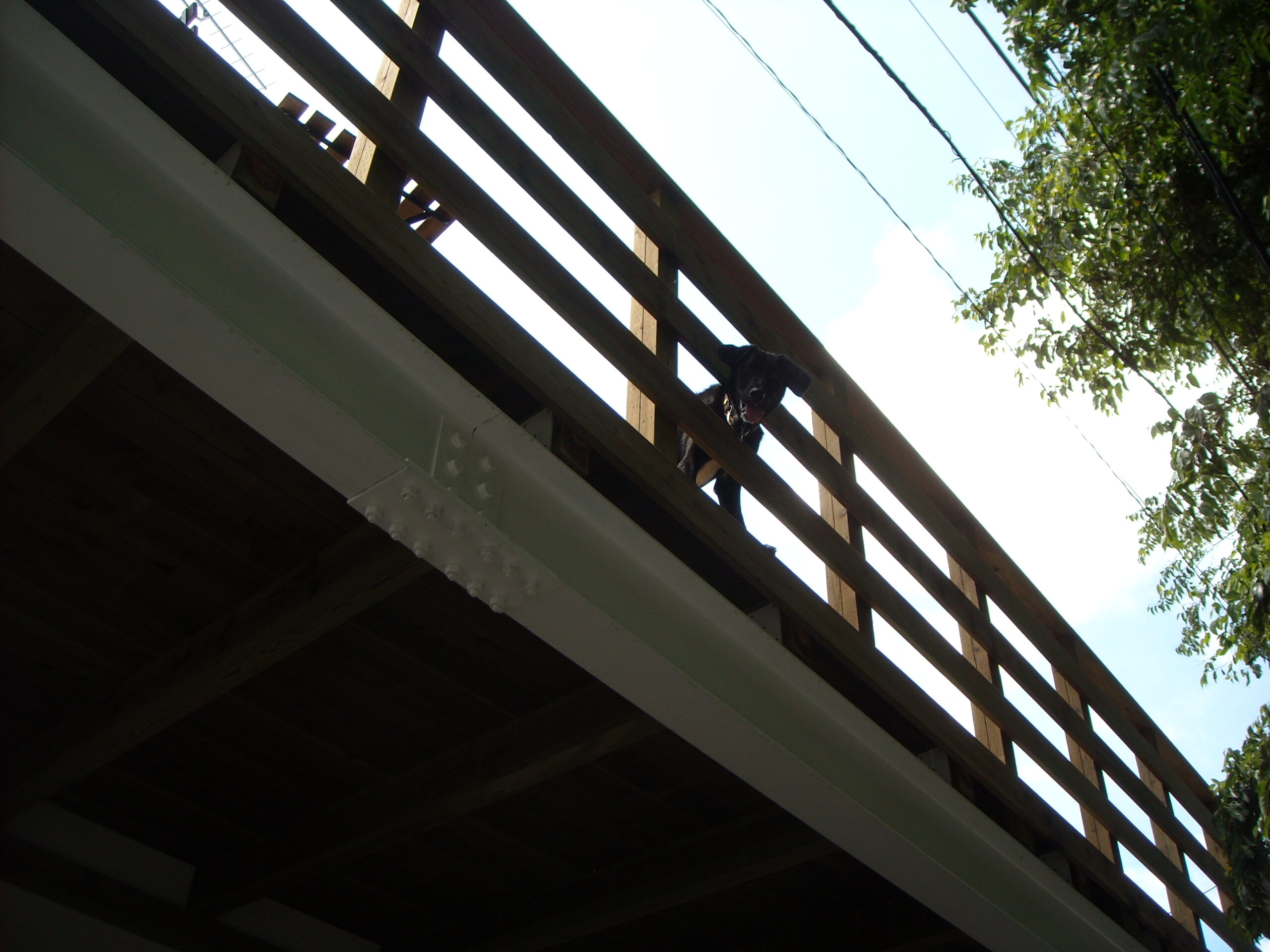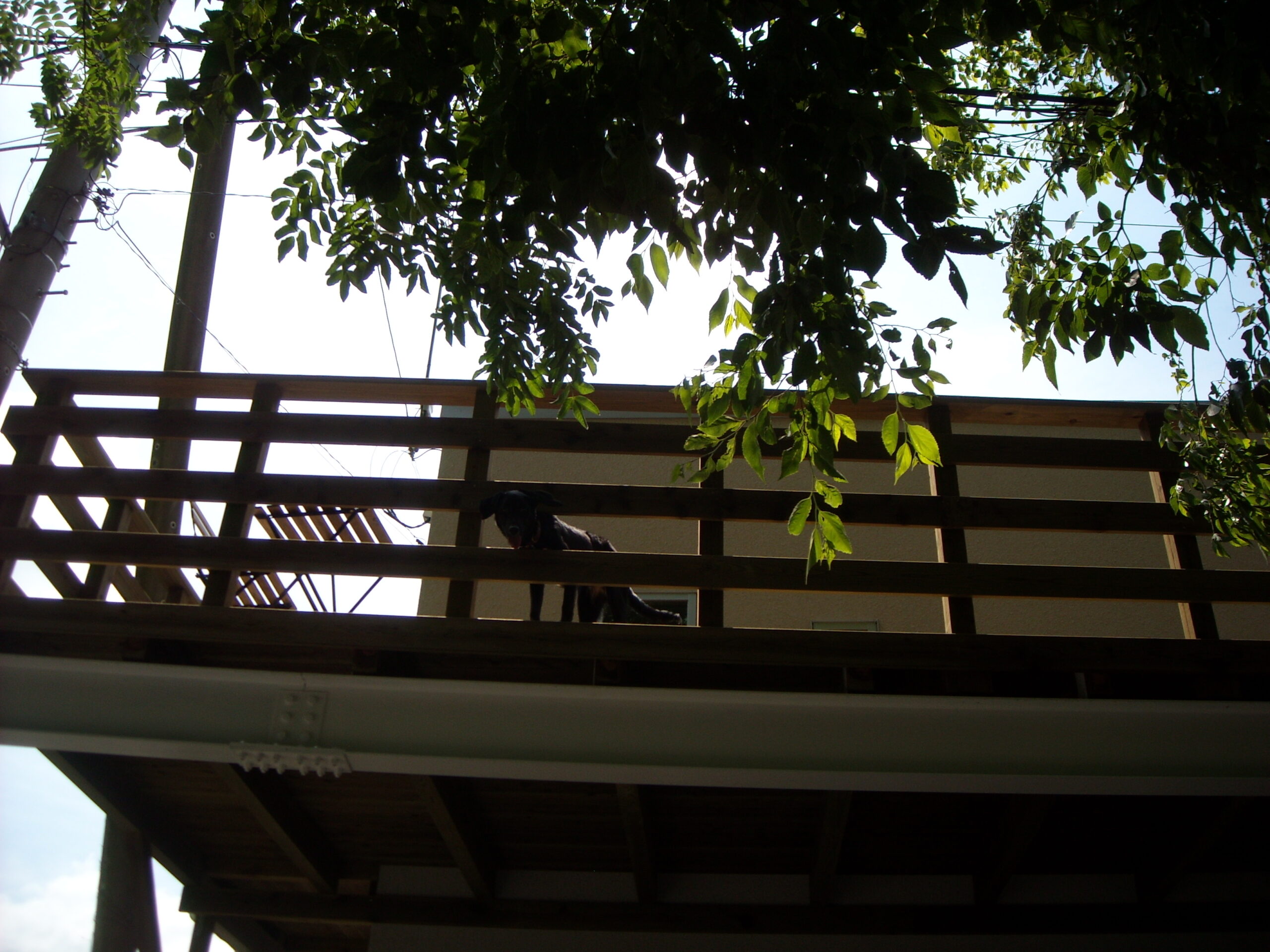 二階の木製ベランダからバスケのゴールを吊ってます。特別にゴールを引っ掛ける木材(LBウッド)で。ペットの犬もいい表情