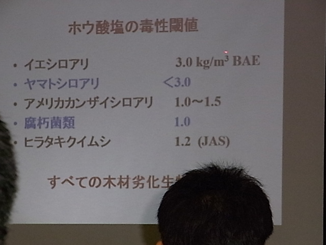 シロアリや腐朽菌には、ホウ酸塩、1㎥あたり3.0キロのレベルで劇的効果をもたらすし、腐りをもたらす腐朽菌には1キロ/㎥レベルで問題ない。ただDOTを長期に木材内部に残存するように表面塗膜を形成するものがあるとなお良い。