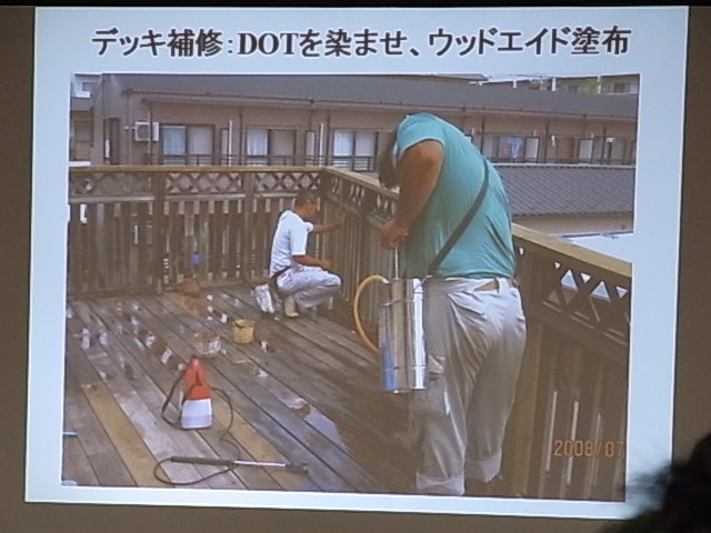 実際のウッドデッキのメンテナンスの方法。17年前に研究者の方の論文参考写真に使われていた。弊社の工事社員が実際に行って、今も行っています。