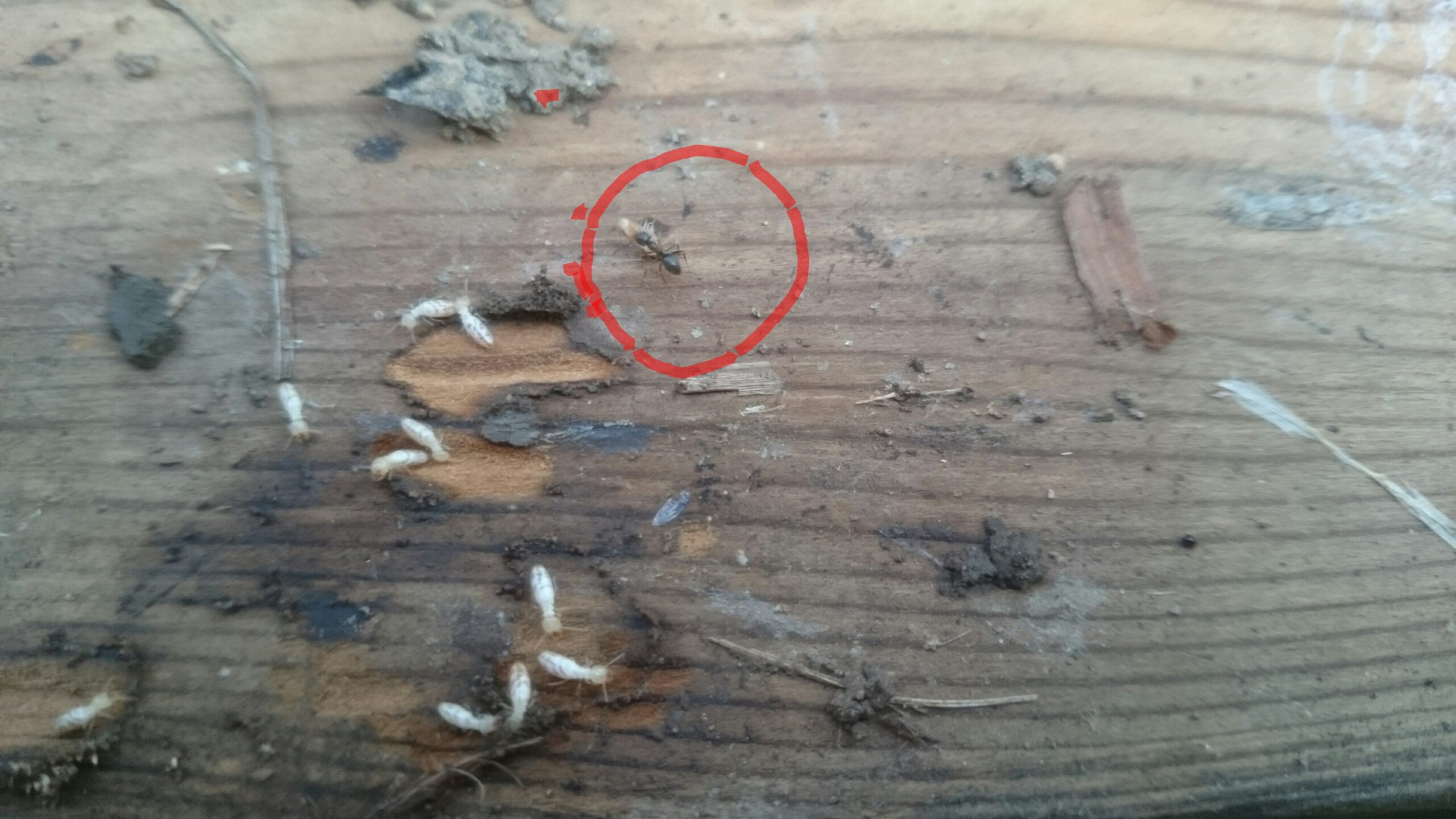 シロアリの挙動を観察していたら、シロアリを食べるため運んでいるクロアリを見ました。知識では、クロアリはシロアリの天敵と知っていたけど、実際にその様子を見るとイメージがはっきりします。(赤丸)