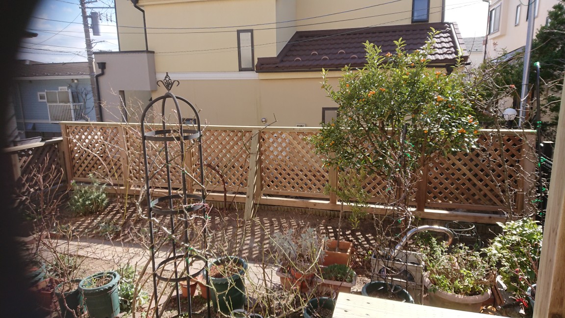 低い方の庭のウッドフェンスを作り、高い方のウッドフェンスは洗浄とDOT散布。