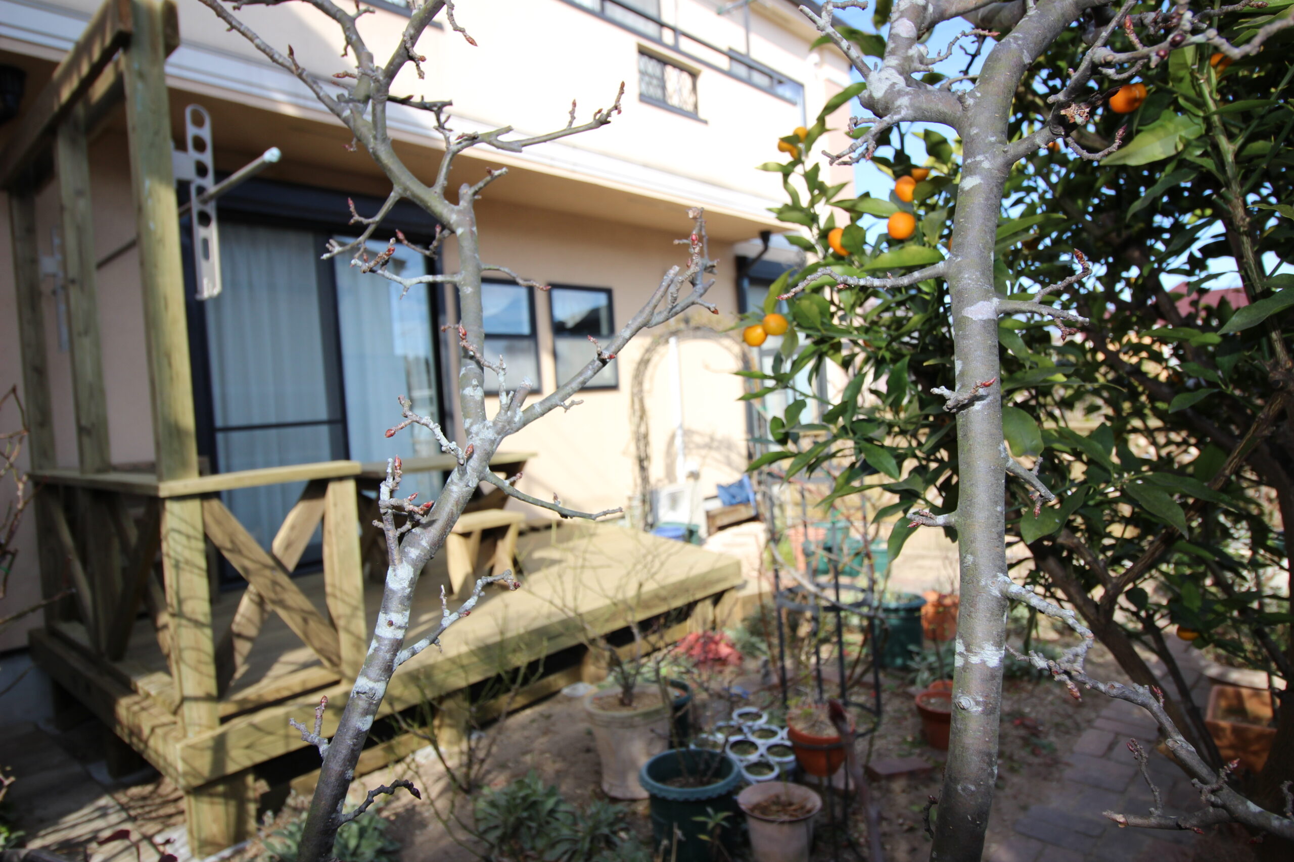 光のあたったベージュの外壁、ウッドデッキの淡いグリーンの色。ミカンの木の葉の濃いグリーン。そこに点在するミカンが、静かな庭だからこそ鮮やかなオレンジ色で浮き立ってます。