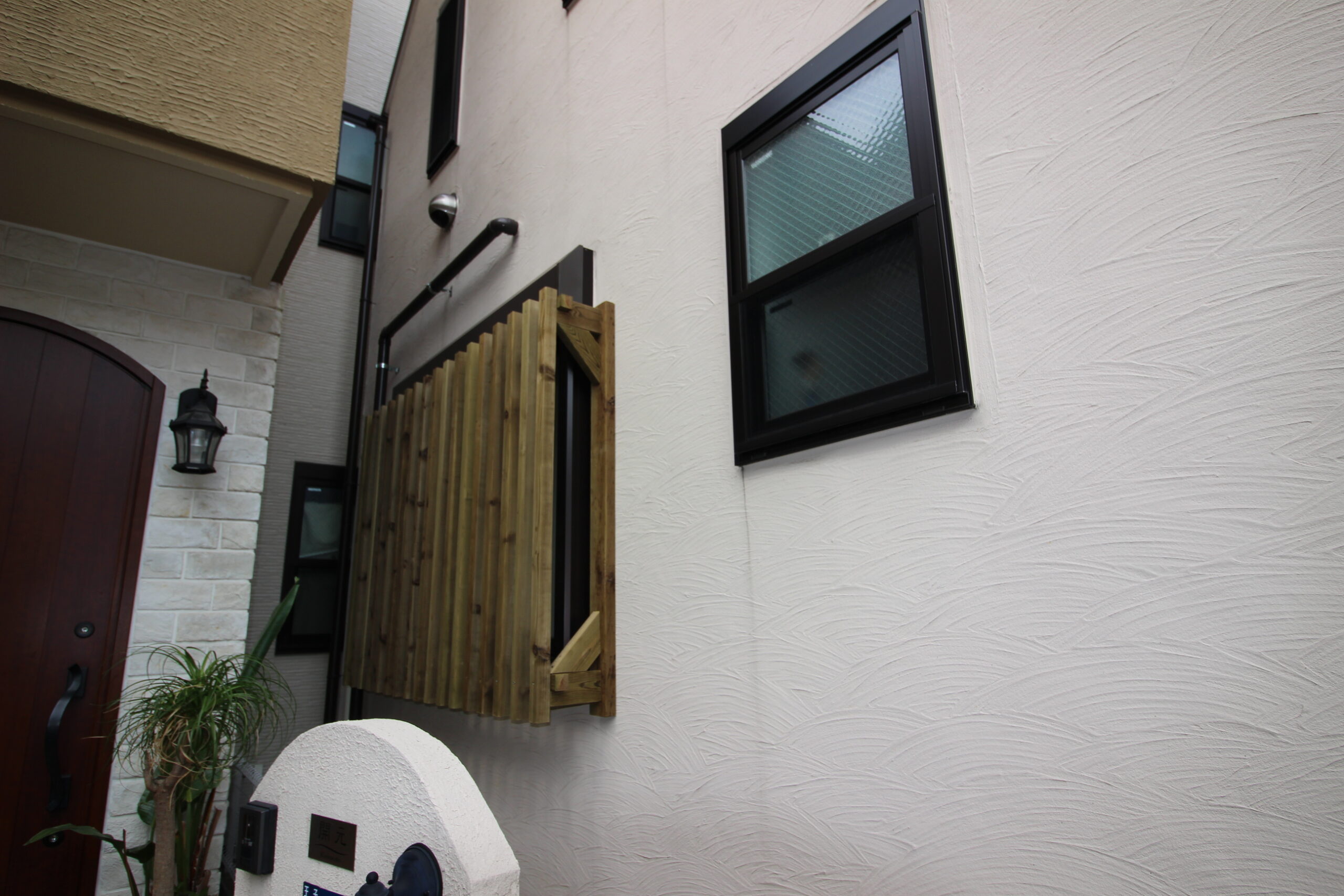 お客様のご要望で、面格子もウッドで。面格子は丈夫で、アルミと違って壊すのは音を立てて却って防犯に役立つはず。
