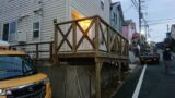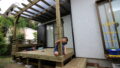目黒区のお宅は、隣地と高低差があり、こちらから見るとお隣さんが丸見え、お隣さんからみると見上げる景色。これを柔らかにプライベート空間を保ちつつ少しでも楽しいデザインを作るため、高耐久処理の木材を使いデザインをして施工。