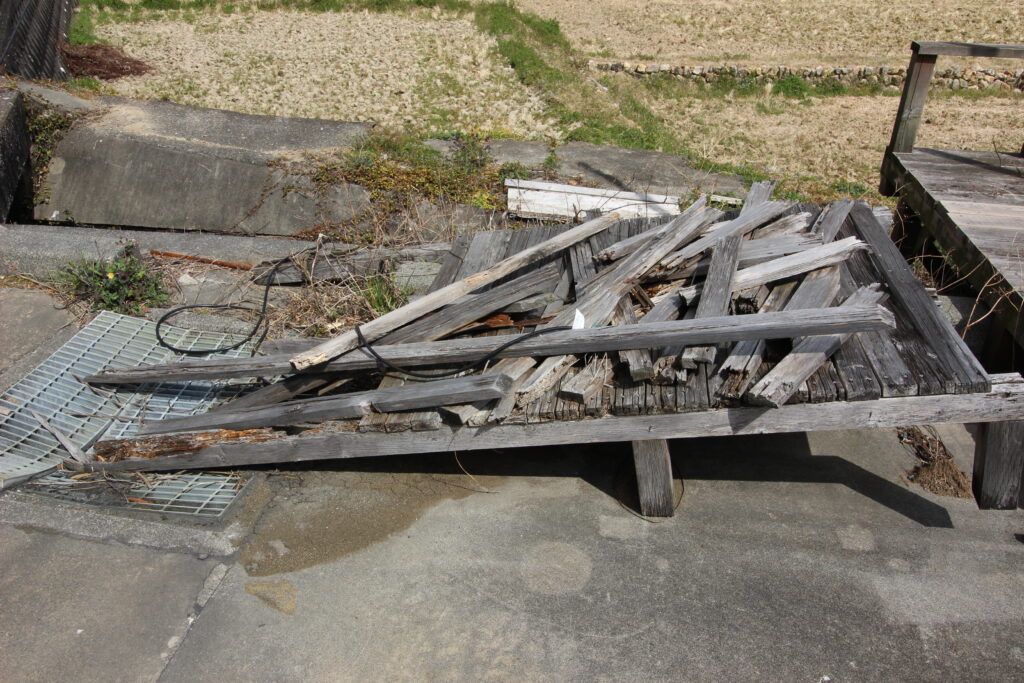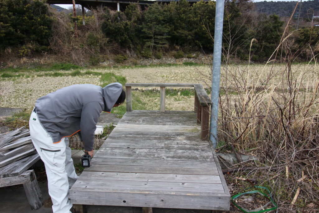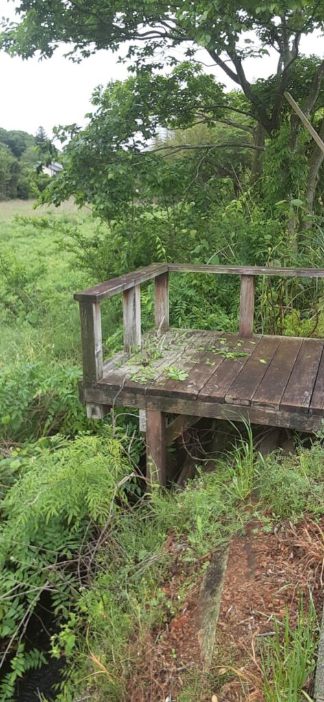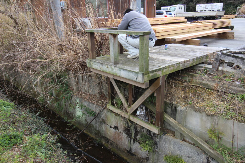 水に接した場所の耐久性を見るため、水路まで足を延ばしてみたのです。(これは、水路に流れてくる流木などが台風の時せき止めた為、数年後地面に設置しなおし)