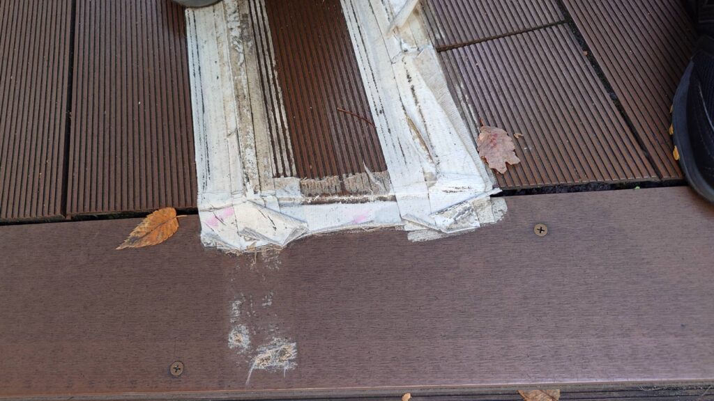 浮き上がりすぎて、しかも割れてきているのでガムテープで補修、こういうケースはお台場のボードウォークでもそこそこあった。ボードウォークは材質感を求めないとは思うので、割れても一旦補修し、部材を交換すればいいのだろう。(コスパ重視でいけば、公共の不特定の人数が行きかうとこなどこれで充分なんだろう)
