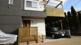 車庫の上デッキから二階のバルコニーへ繋がる、本物の木だからの素材がすっかり風景と統一感・・町田市
