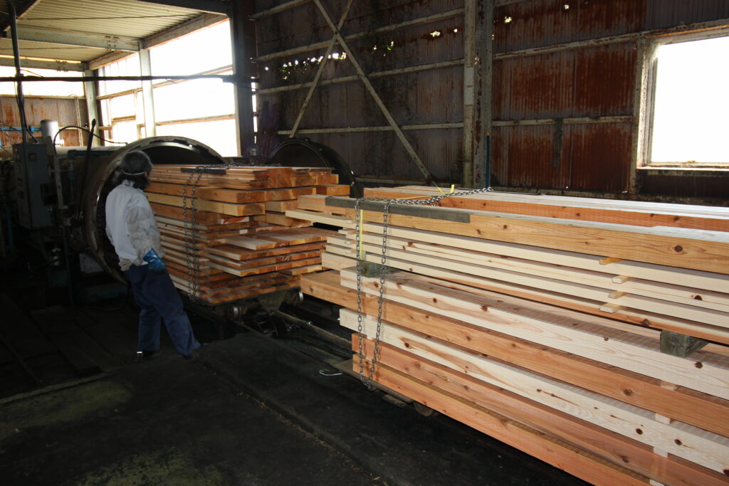 加圧注入の釜に送り込みます。加圧の圧は14kg/㎥、注入の前に30㎜厚以上の材はより保存剤が入るように、人為的なキズのインサイジングしています。