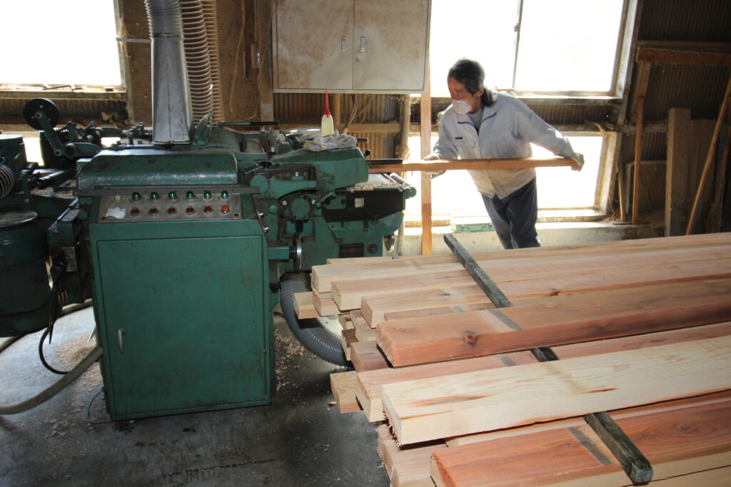 製材されてきた国産材(主に三河材)をプレナーという大型カンナで、表面を削り、このあと人工的なキズ(インサイジング)をつけ、ACQ保存剤をより浸潤させます。