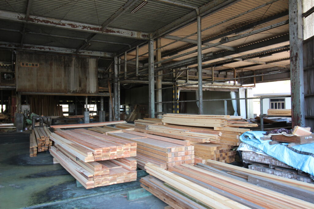 プレナーしたあとの,国産スギ材、ヒノキ材を加圧注入前に保管。1980年代~20005年までは、外国産材なども、ACQ加圧注入していましたが、より耐久性が高くなる国産材に切り替えています。