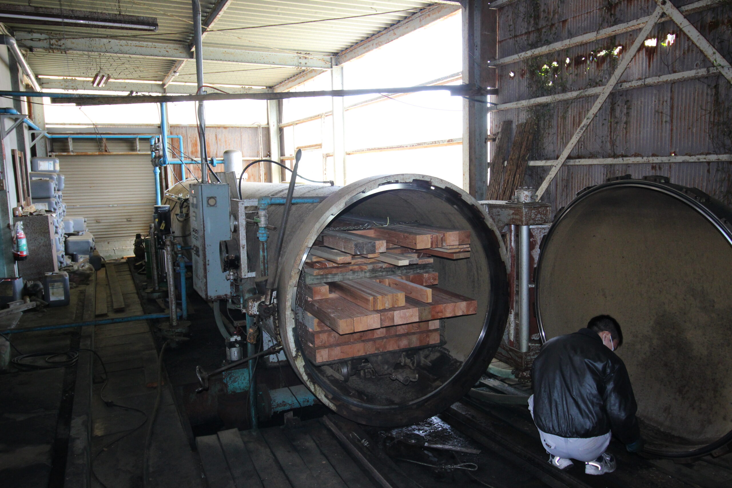 この釜を使い、次の工程で、DOT(ホウ酸)を木材の芯まで減圧で浸潤させるときにも使います。