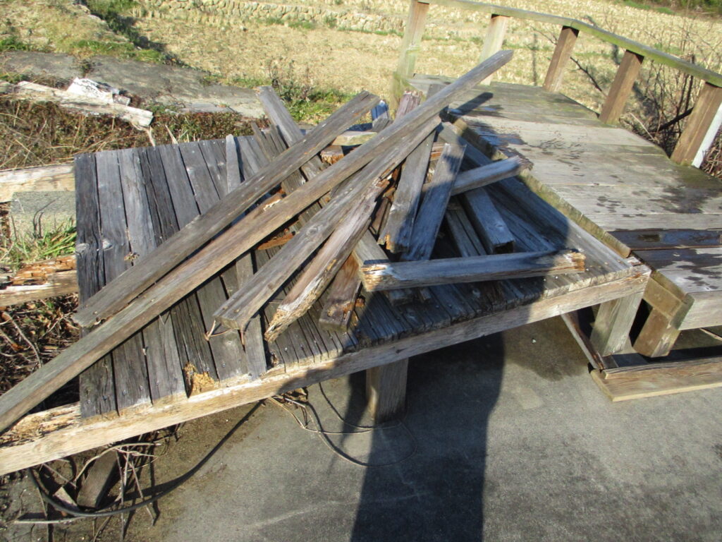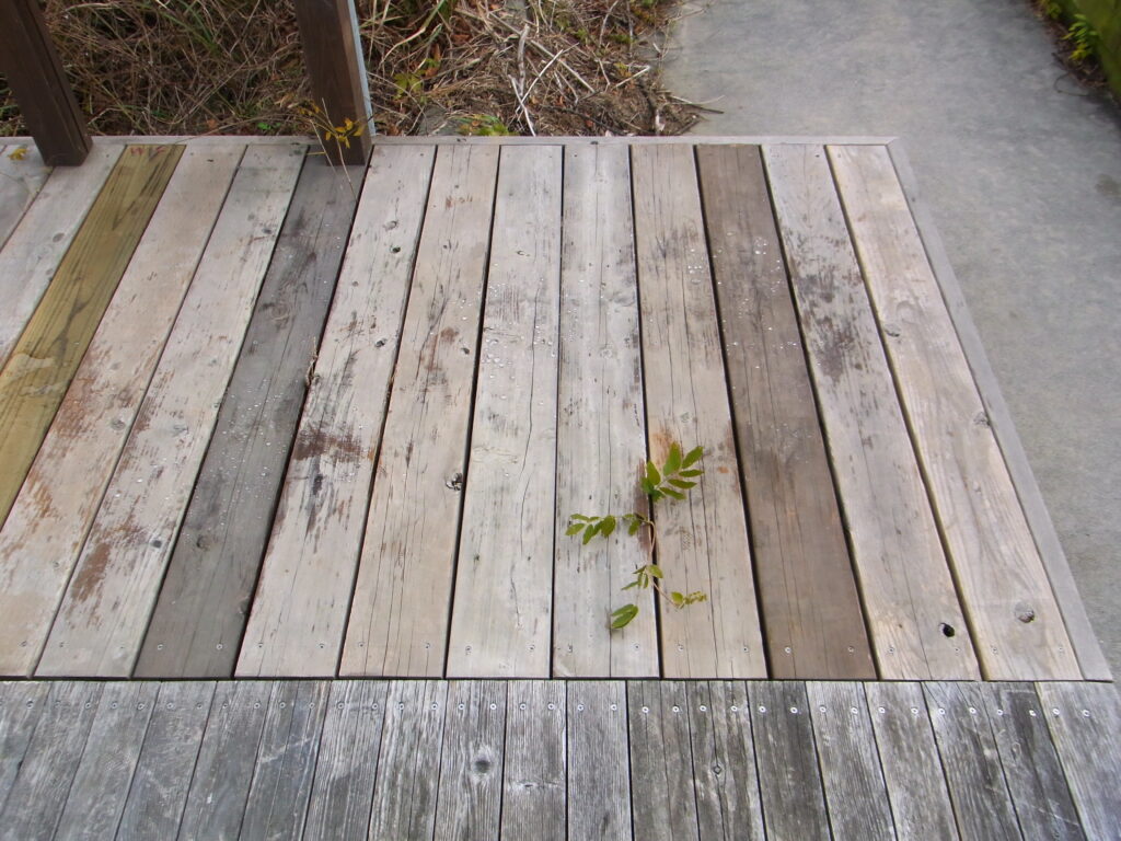⑤右のLBウッドのウッドデッキは大丈夫だが、作って8年でこういう状態のウッドデッキに。