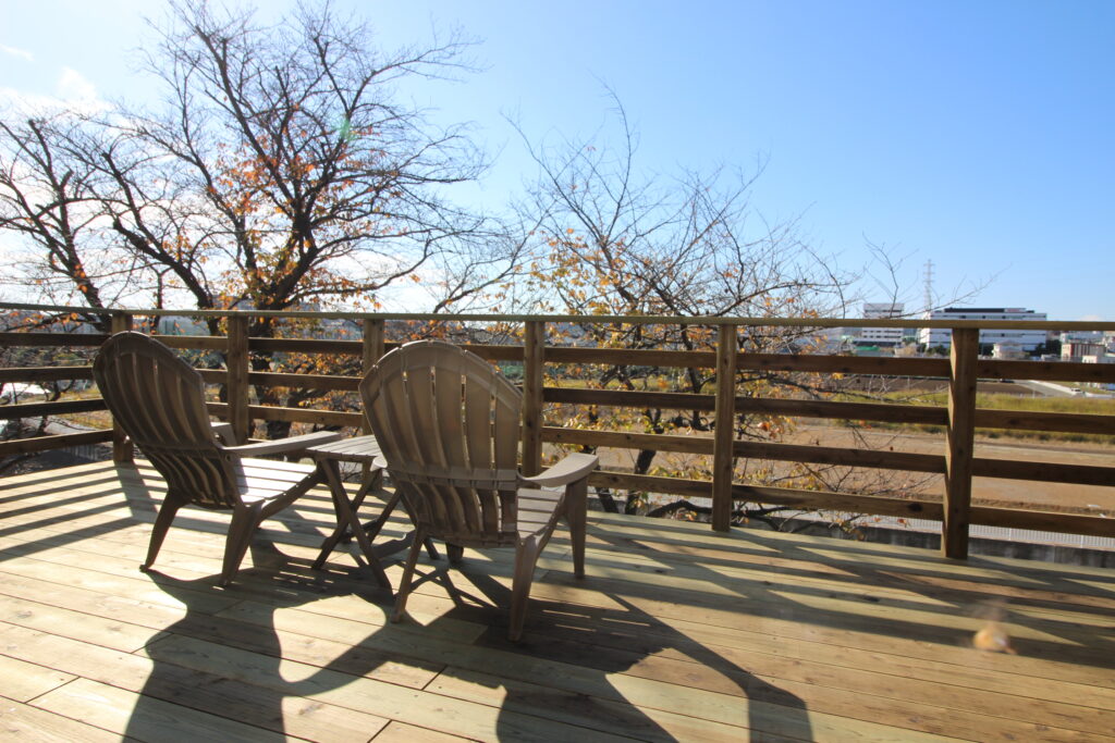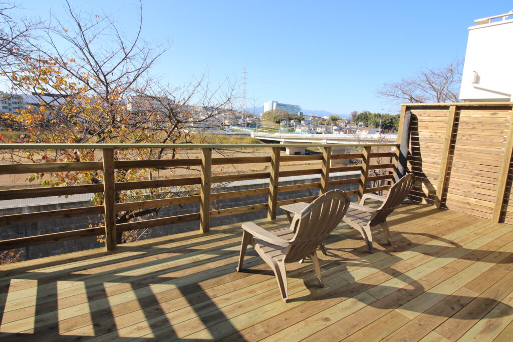 ウッドデッキからは川の流れを間近に感じられ、四季の移ろいを楽しめる空間に。