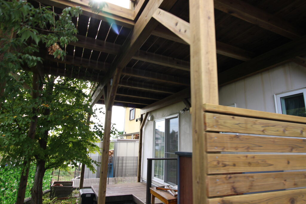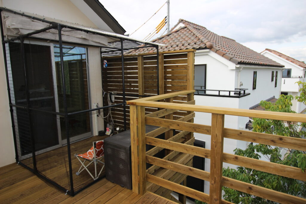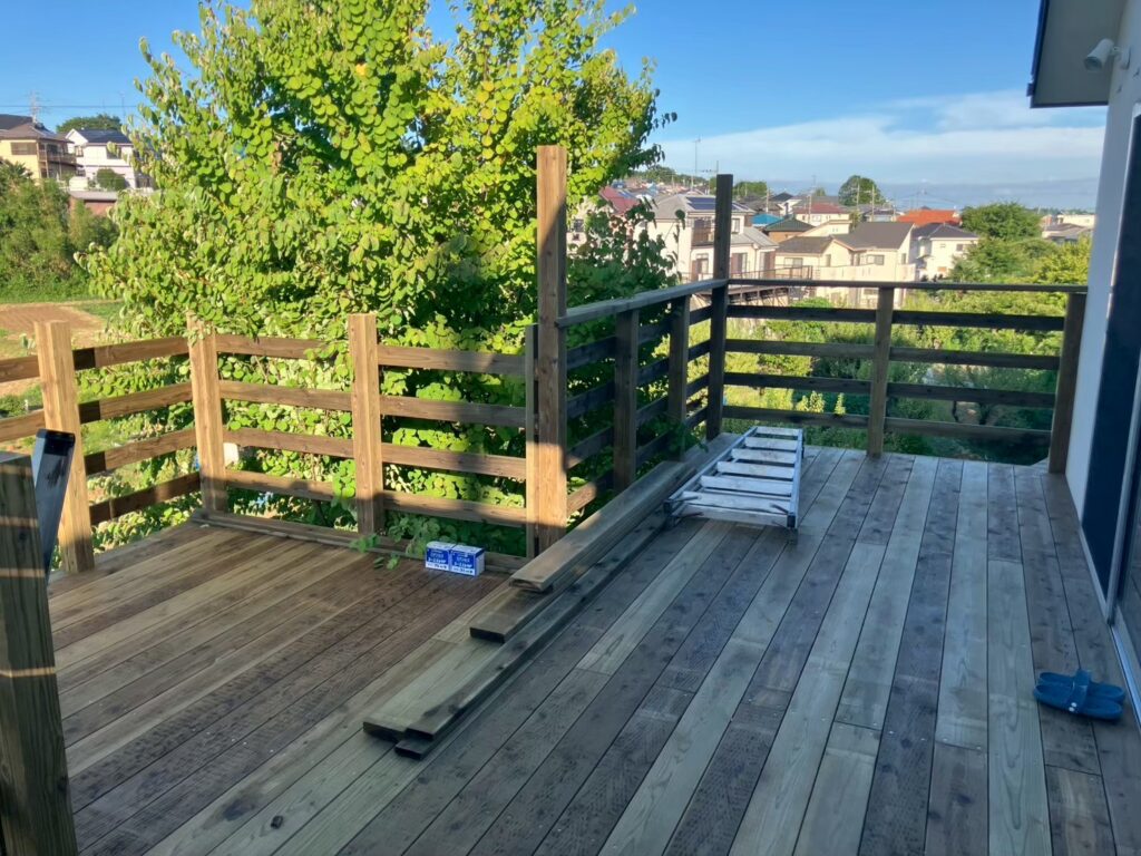 使用したのは国産の高耐久天然木材。日本の気候に合わせた処理を施し、長く安心して使えるデッキに仕上げました。