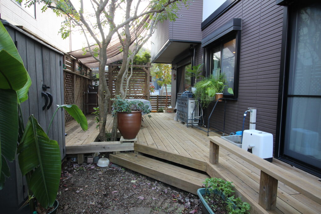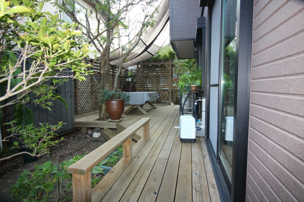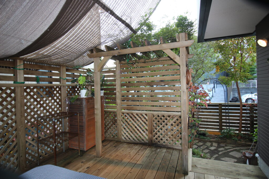 居間に直結のウッドデッキ。パーゴラも楽しんでいるうちに、そこへ収納ボックス入れたら、気が付くと暗くなっていたそう。