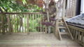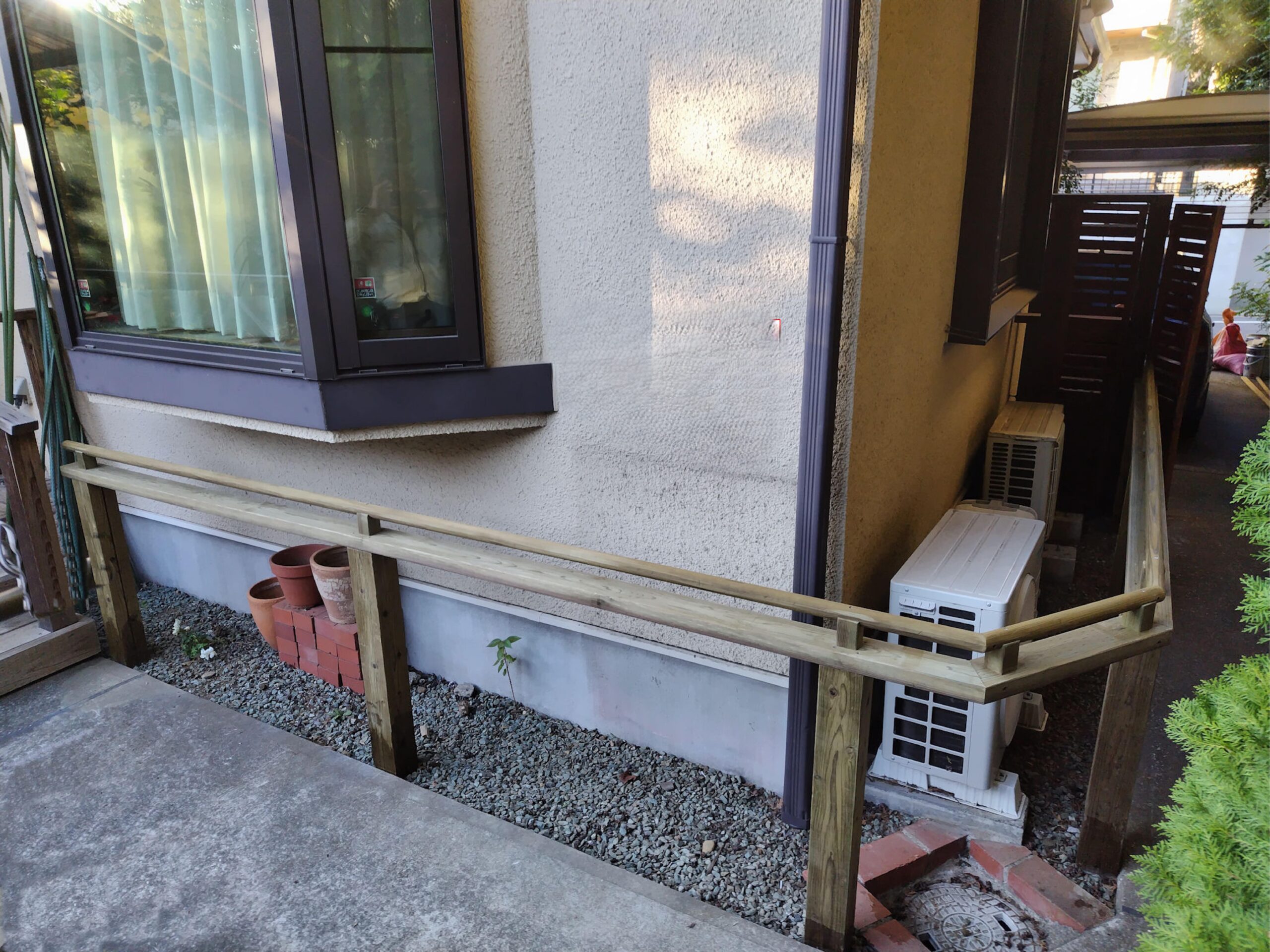 ウッドデッキから玄関まで、歩く場所に、手すりを付けたいと。18年前工事したM君。