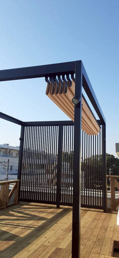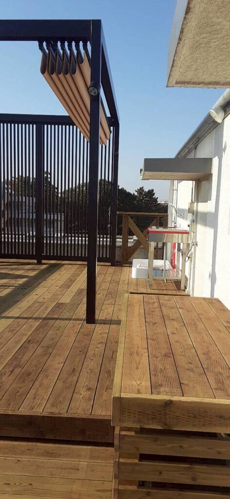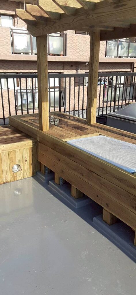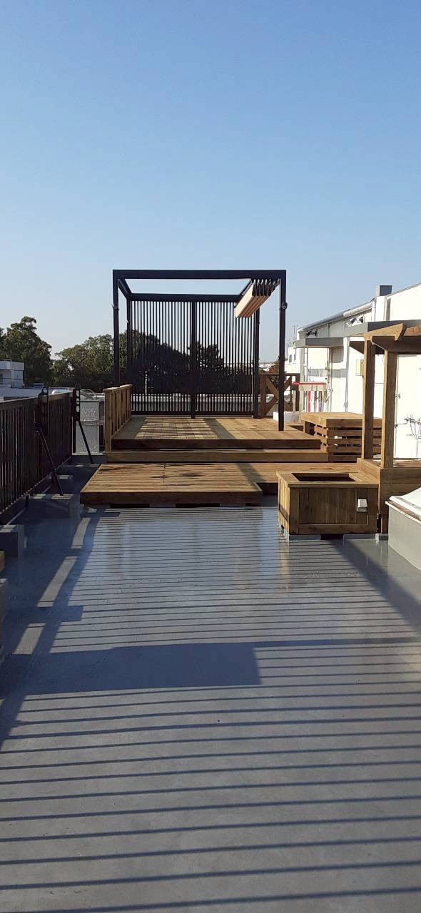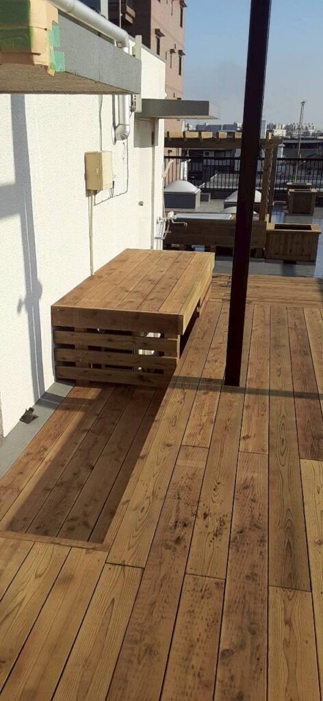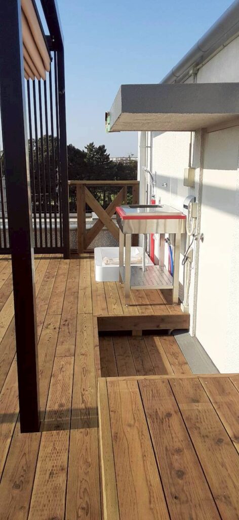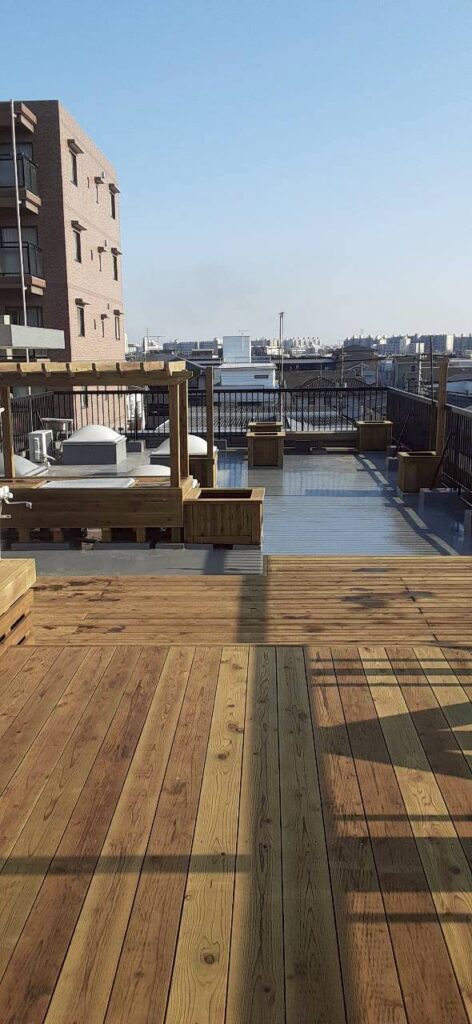 日本の木を高耐久処理したLBウッドで、無機質な屋上にも、緩やかな温度感が出現。