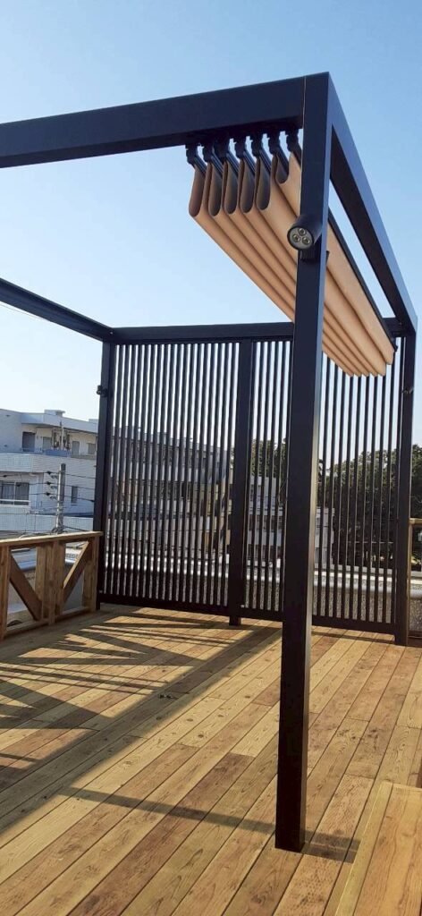 屋上バルコニー澄み渡る青空に、高耐久処理の国産材LBウッドの色が、冴えてきた。