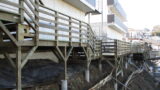 この写真で理解しやすいけれど、ボードウォークを波が入って腐朽しないよう幕板でふさいだことで、腐りやすくなったと考えたようで、幕板を外して、通風の方を重視している。