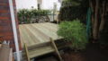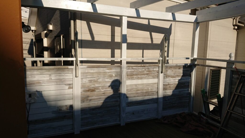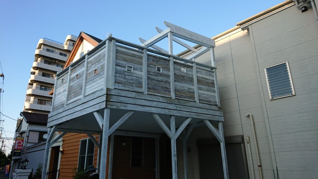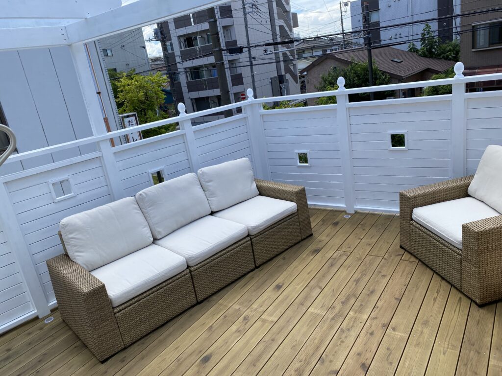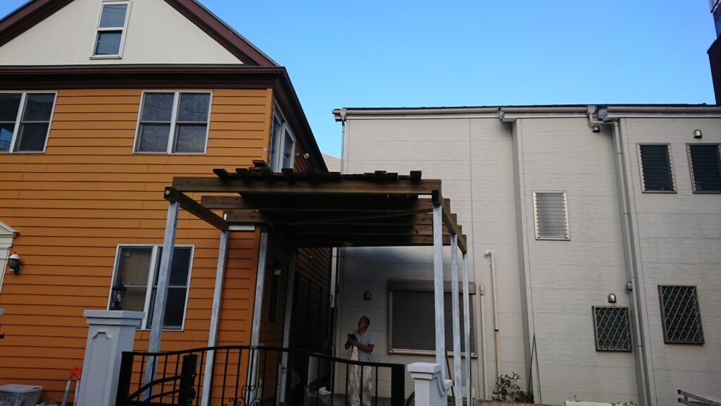 ウッドデッキの半分を覆うパーゴラが空に拡がる.
