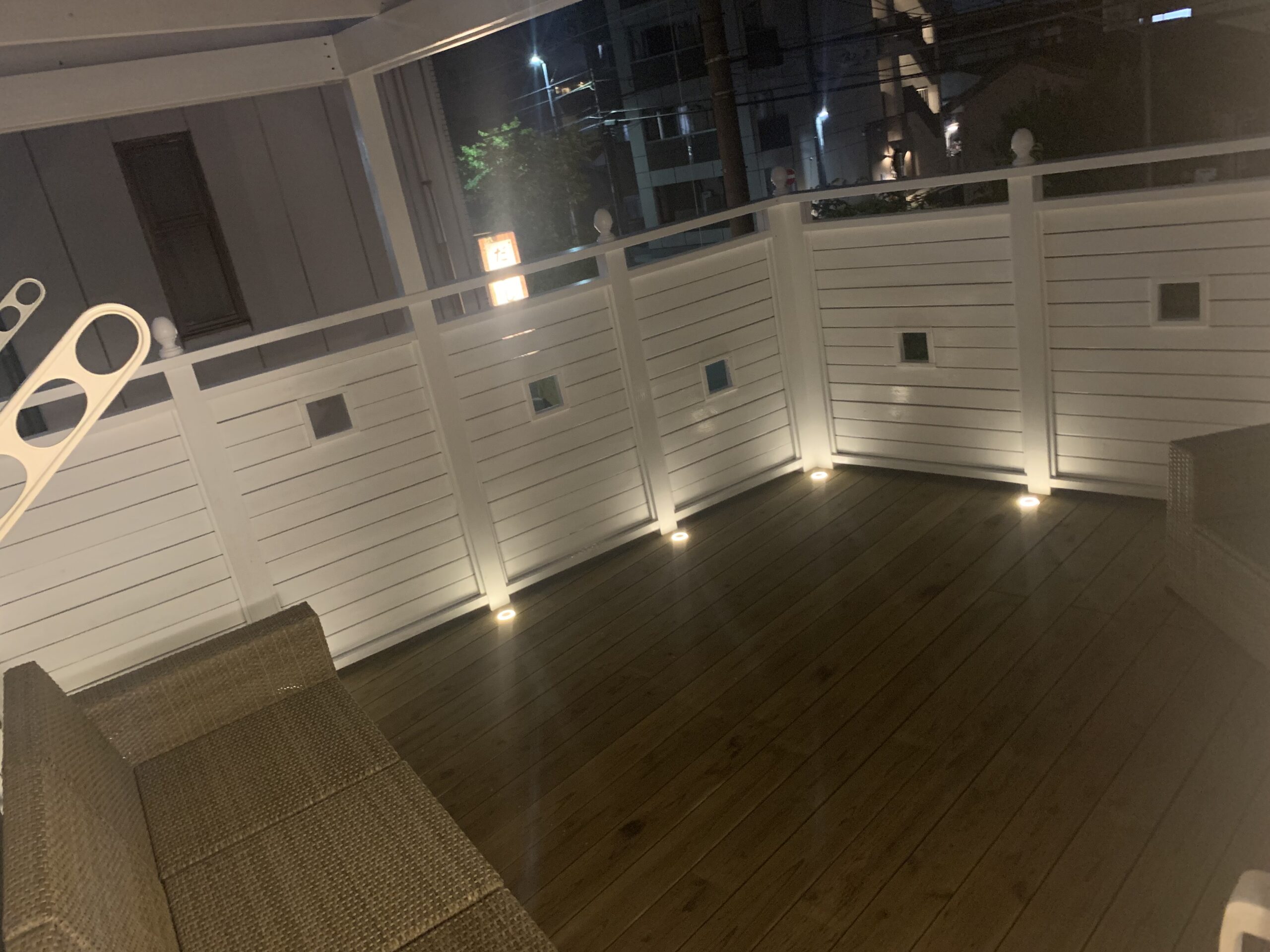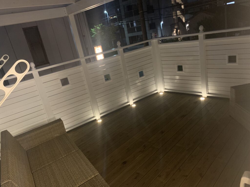 夜の静寂(しじま)に、床に埋め込まれたライトが白色のフェンスとパーゴラの影を作り出す。