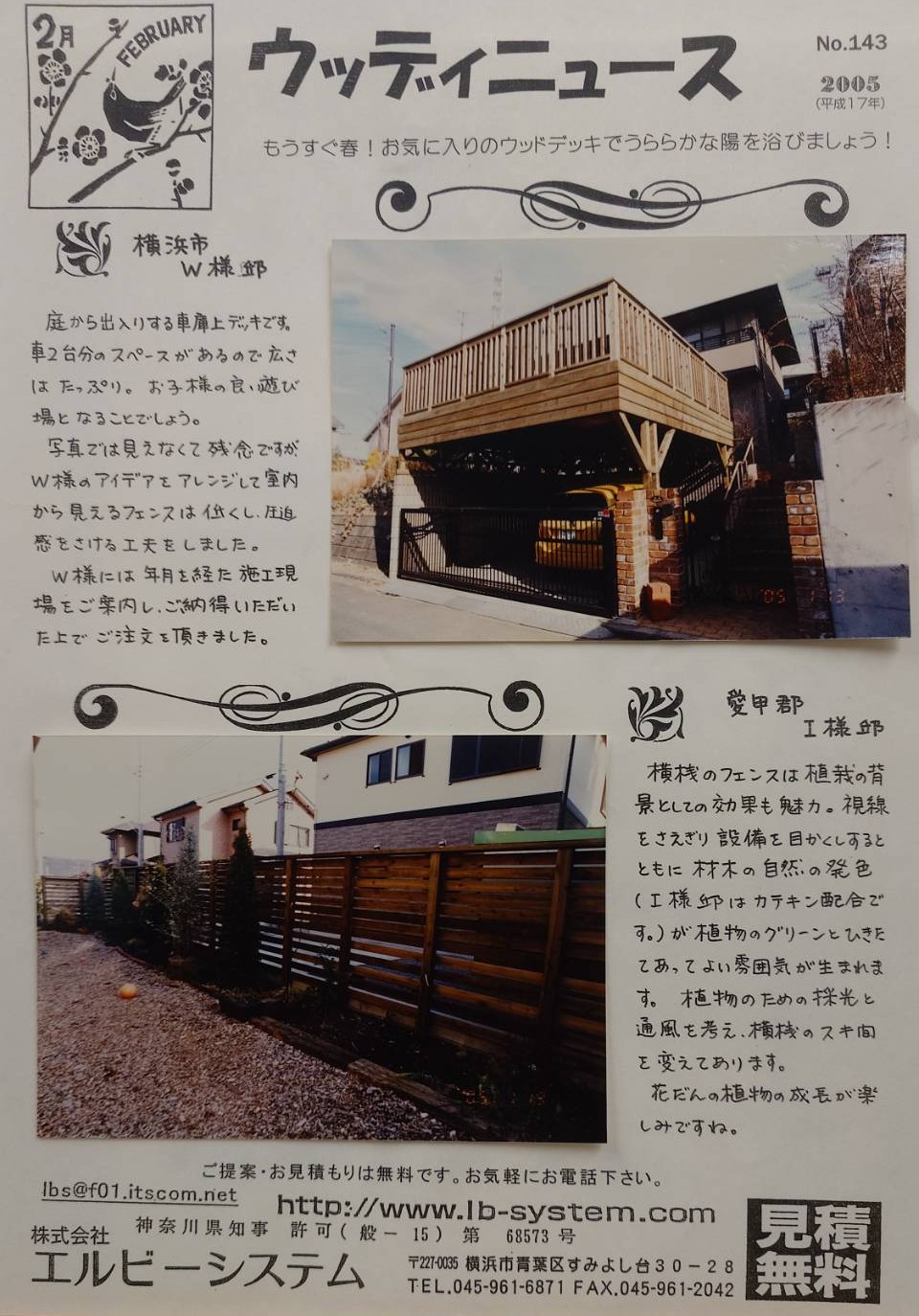 完成写真のアーカイブ集(2005年・2月)・・横浜市青葉区の車庫上ウッドデッキ(ガレージデッキ)と愛川町の横のフェンス