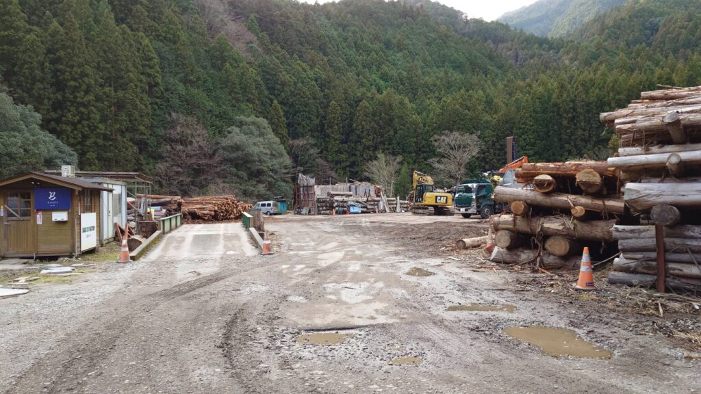 全ての木材が、建築資材、エクステリア材として使えるわけで無く、枝打ち、間引きでうまれた間伐材、風倒木などを集積した土場。