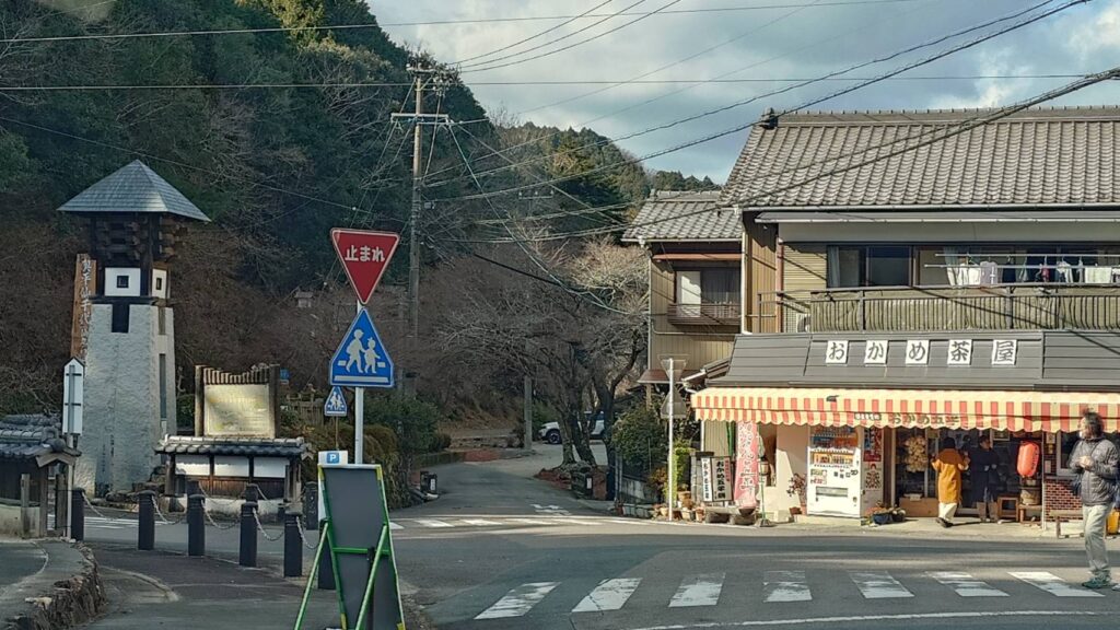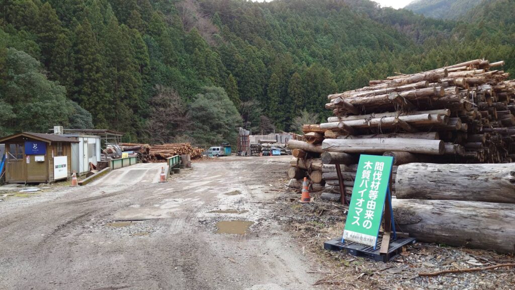 鳳来寺の参道口に向かう道すがら、間伐材や倒木を集めた、木質バイオの集積場があった。