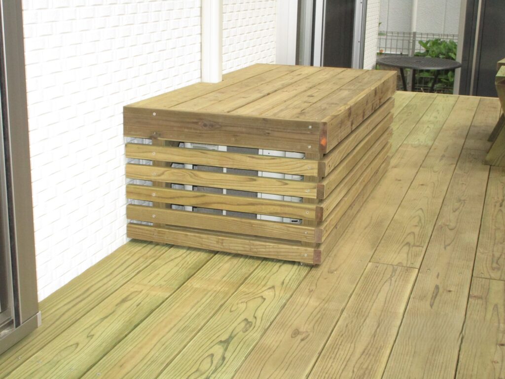 ダクト隠しも欠き込んで、室外機カバー。ここに乗ってもOK。強い耐荷重をもつ軽量のウッド。
