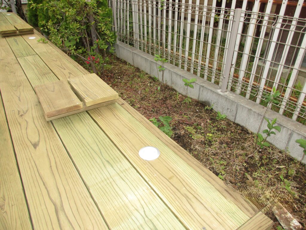 同じLBウッドでウッドデッキ上の鉢置き台、室外機カバー、イス・テーブルセットも作っています。