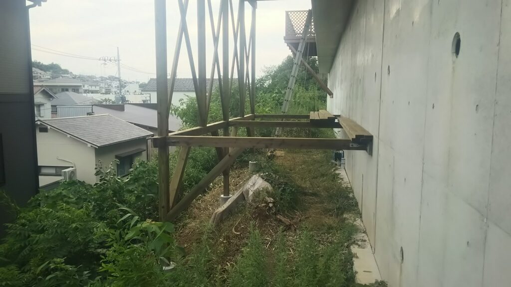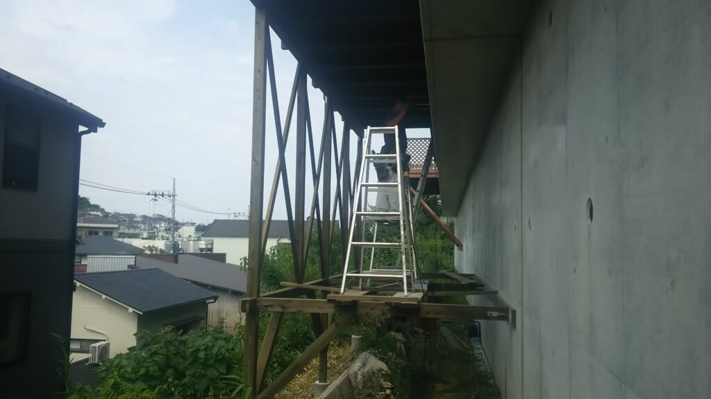 脚立を立てられるように(これはメンテナンスの時、脚立が立たたないと余計な費用付きになるので)構造を組み立てるのです