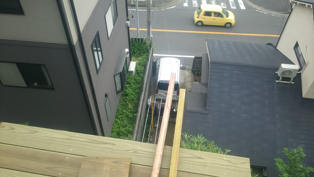 地面が遠いし道路も遠い。写真ではすぐそばに見える黒いのは、屋根です。