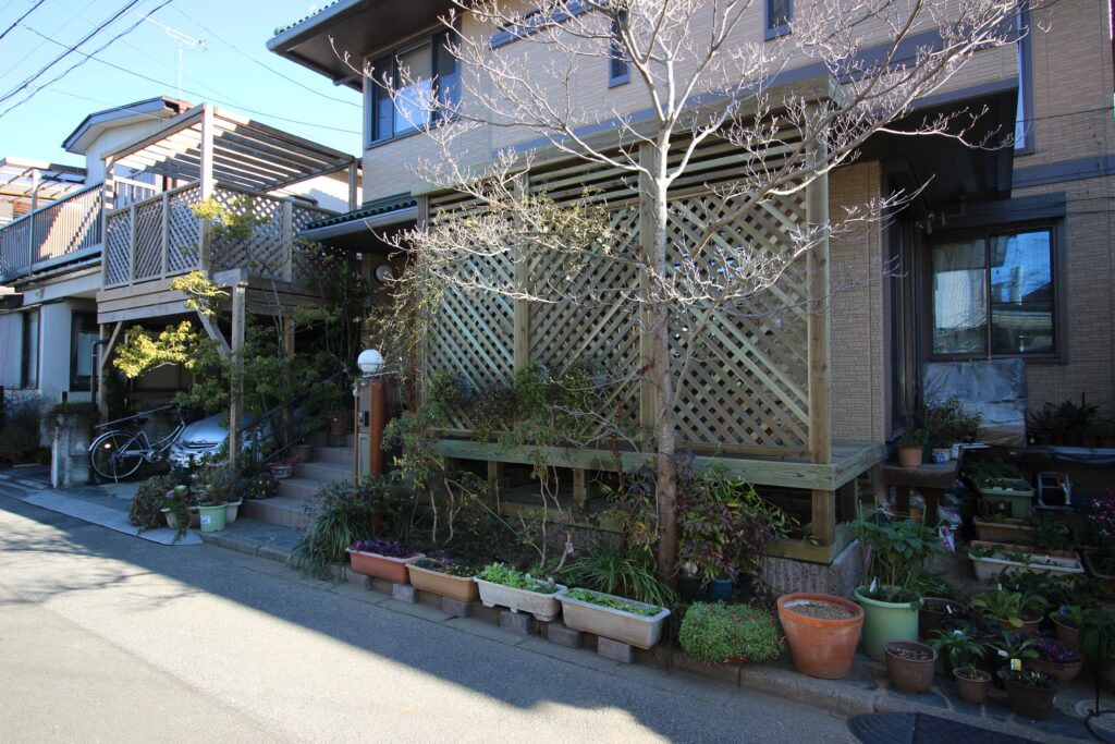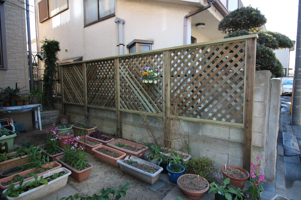 フェンスも、ハンギングバスケットを掛けられつつ花の背景に活躍