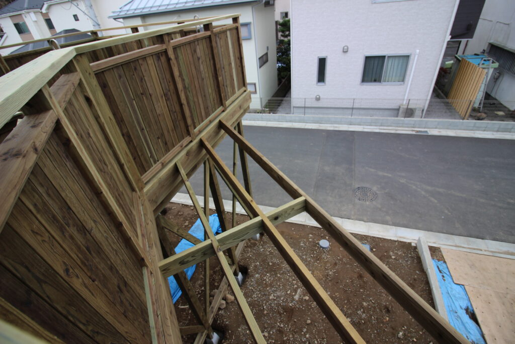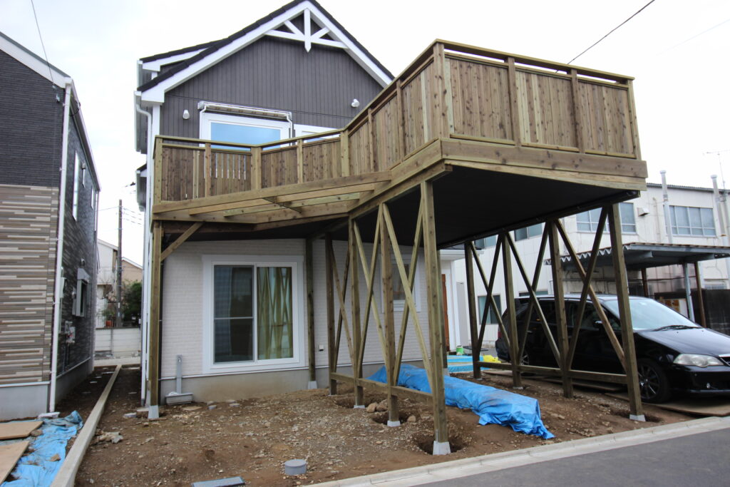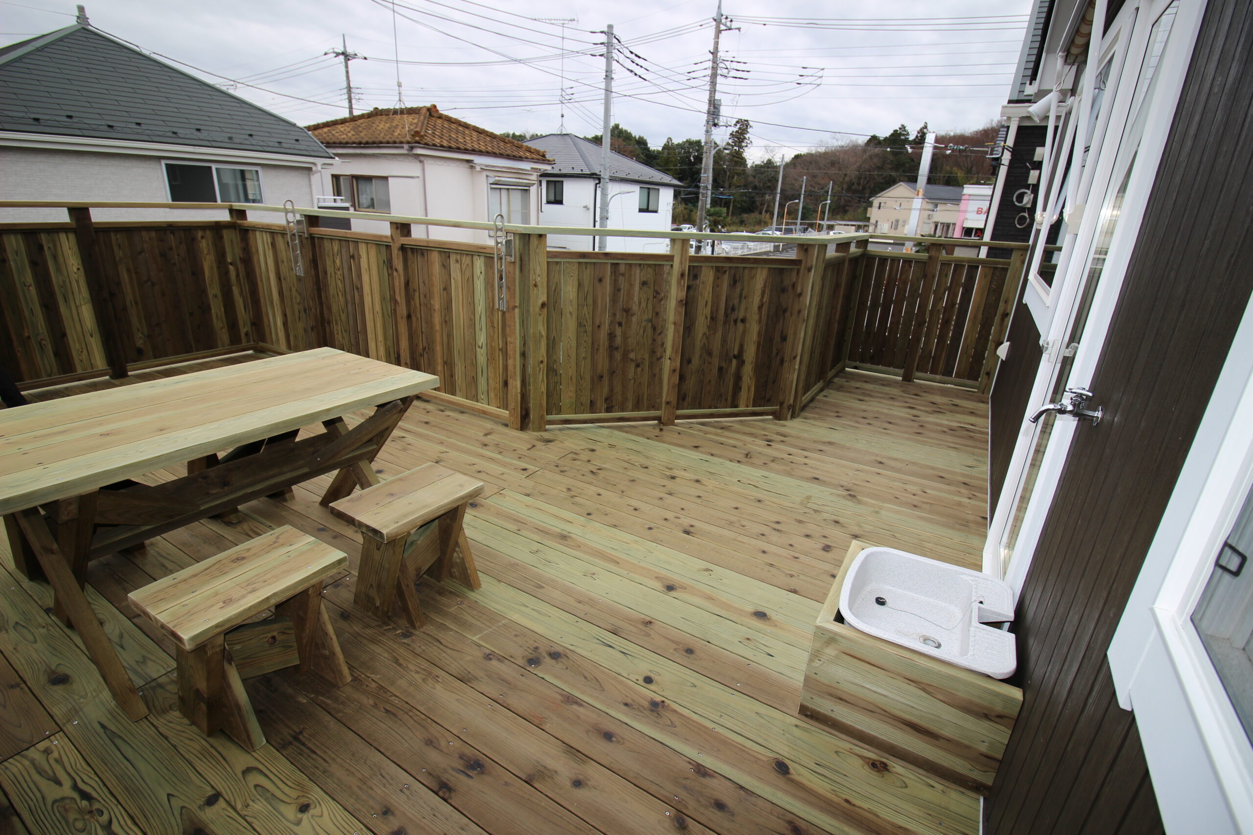 ウッドデッキの上は多角形で、変化に富んでいます。水道工事もウチの社員が、下の水栓を分岐させて上に、排水も同時に下に持ってきています。